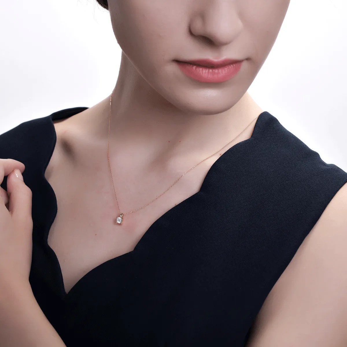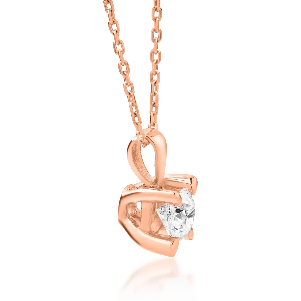 Acest lanț cu pandantiv din aur roz, încrustat cu un diamant de 0.4ct, își propune să scoată în evidență eleganța și individualitatea. Lumina reflectată de diamant, tăiat cu precizie, se completează perfect cu nuanțele calde ale aurului roz pentru o aparentă sofisticată și naturală. Ideal pentru femeia modernă care îmbină simplitatea cu expresivitatea.