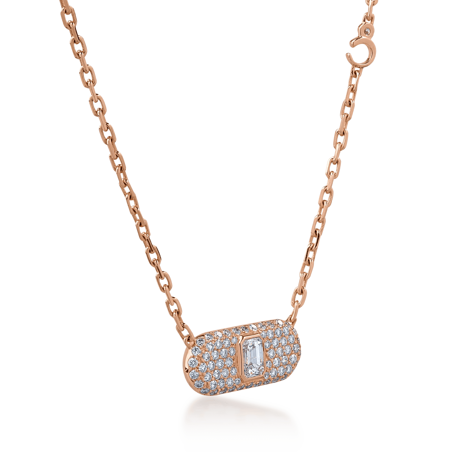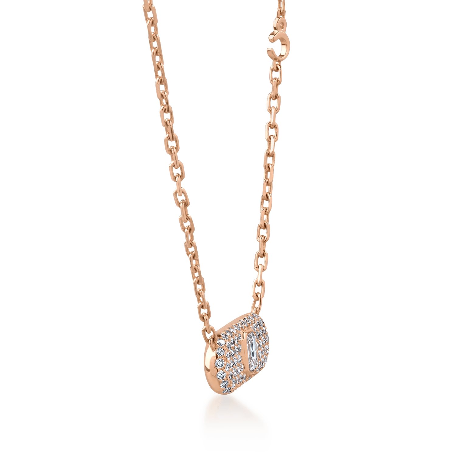 Descoperă farmecul unic al acestui lanţ cu pandantiv din aur roz, decorat cu diamante baguette şi rotunde de 1.19ct. Designul său sofisticat şi elegant îmbină tăieturi geometrice şi o montură lucrată cu fineţe, oferind un echilibru perfect între modern şi clasic. Detaliile delicate şi reflecţiile spectaculoase ale diamantelor îmbogăţesc orice ţinută, făcând această bijuterie o alegere rafinată.