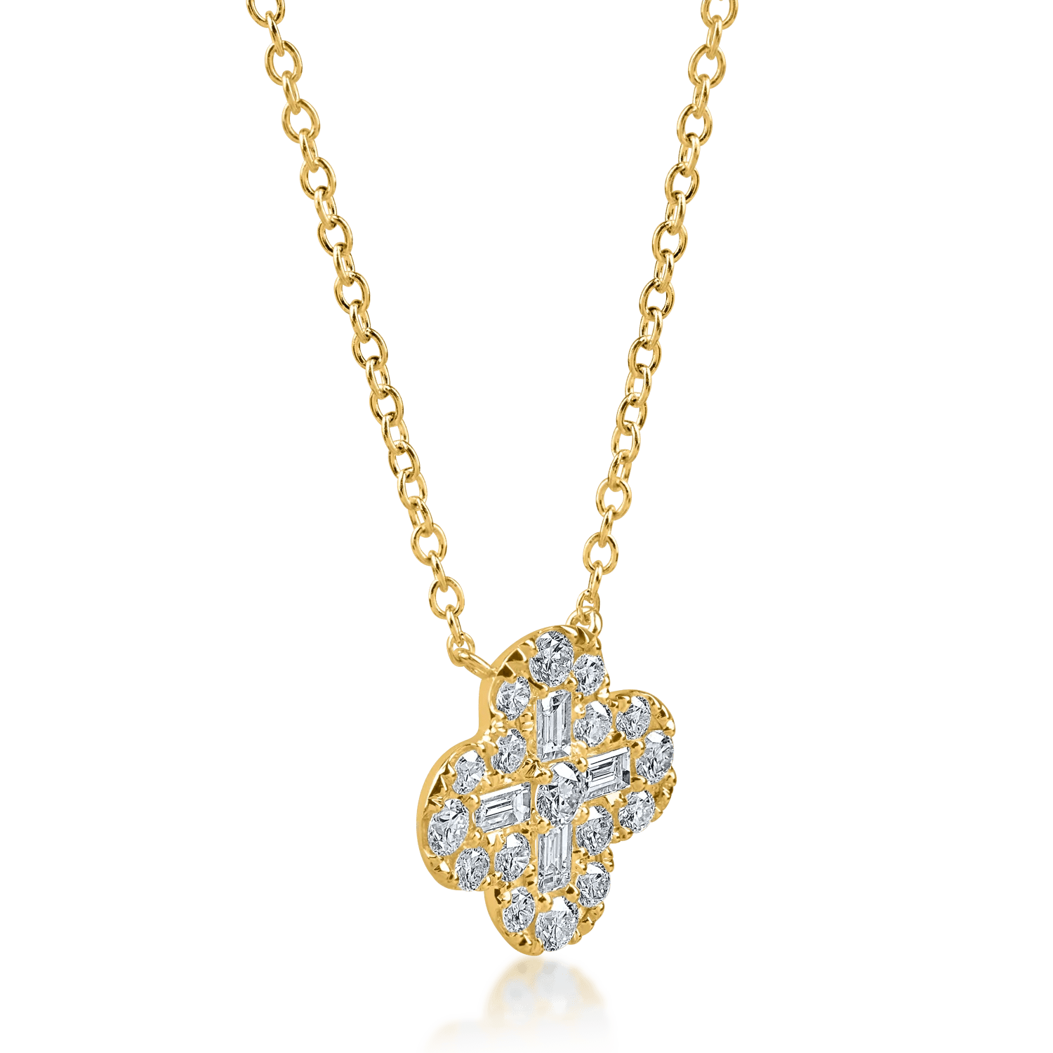 Acest lanț cu pandantiv floare din aur galben este decorat cu diamante baguette și rotunde, însumând 0.93ct. Designul său rafinat oferă o strălucire subtilă și un aer elegant, potrivit atât pentru evenimente speciale, cât și pentru a adăuga lux ținutelor de zi cu zi.