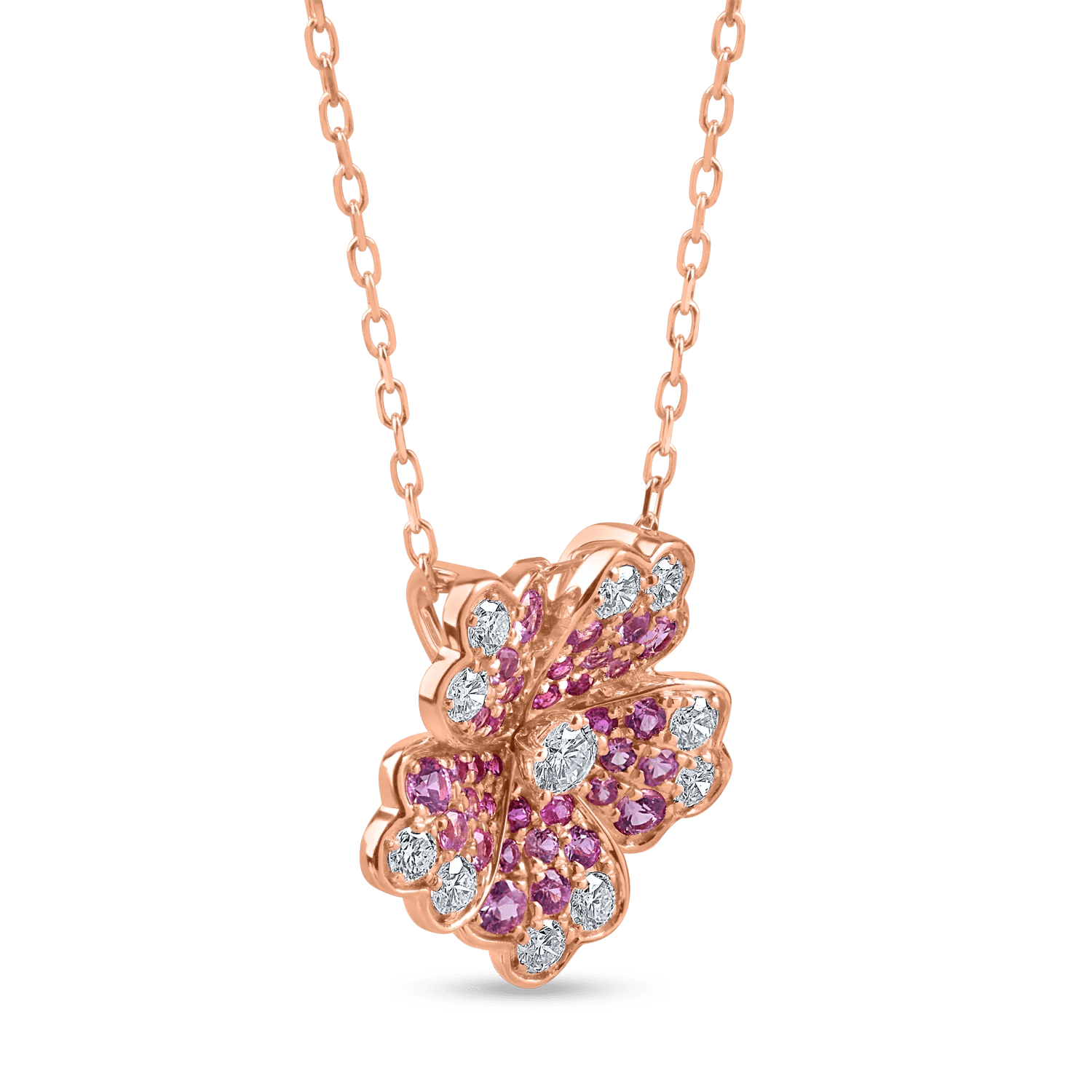 Explorează eleganța cu acest lanț fascinant cu pandantiv floare, realizat din aur roz. Înfrumusețat cu diamante de 0.4ct și safire roz de 0.6ct, această bijuterie se evidențiază prin armonia pietrelor și rafinamentul designului. Combinația dintre aurul cald și strălucirea pietrelor creează un design floral deosebit.