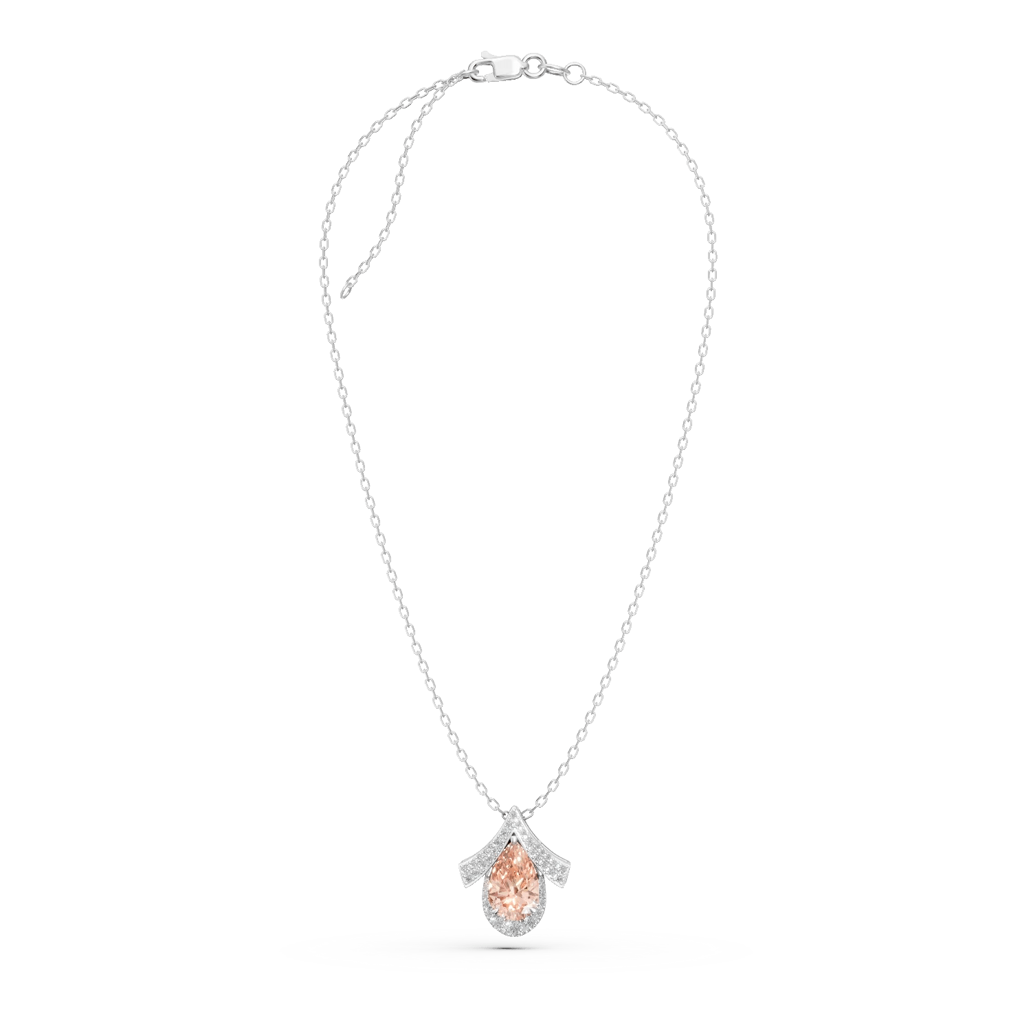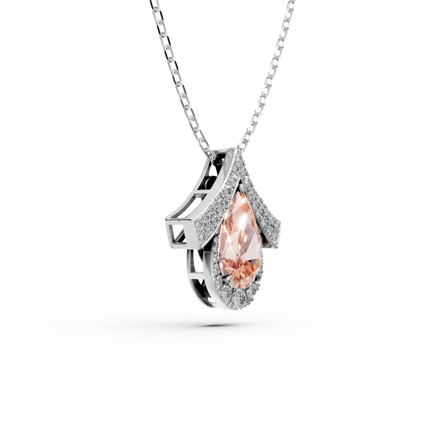 Acest lanț cu pandantiv din aur alb îmbină un design geometric elegant cu un diamant central fancy roz pera, înconjurat de diamante incolore de 2.5ct produse în laborator.