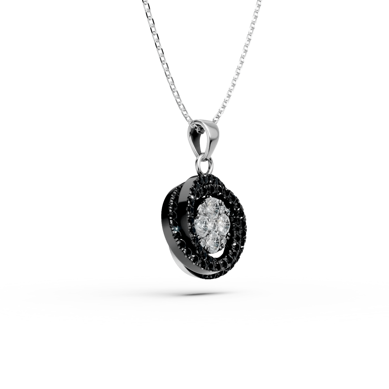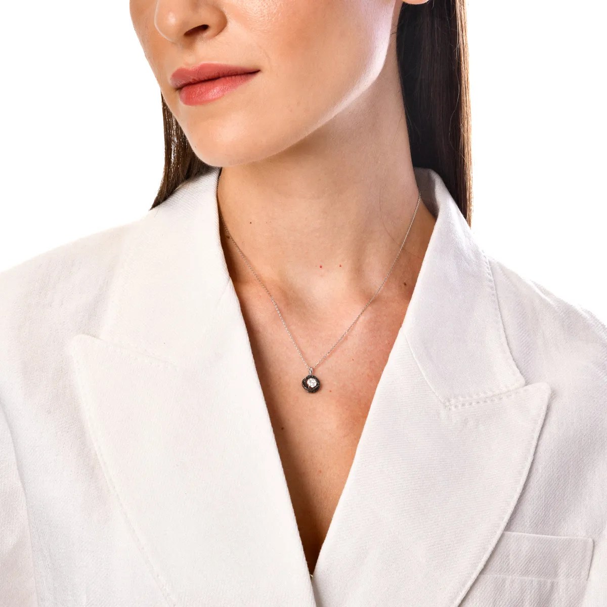 Adoptă un stil distinct și alege o bijuterie remarcabilă. Tinutele tale vor căpăta un aer proaspăt prin accesorizarea cu acest lanț cu pandantiv geometric din aur alb, decorat cu diamante incolore și negre de 0.3ct. Designul său modern îmbină contrastele cu rafinamentul, creând o piesă unică, plină de personalitate. Este bijuteria ideală pentru femeia încrezătoare, care apreciază eleganța în forme inedite.