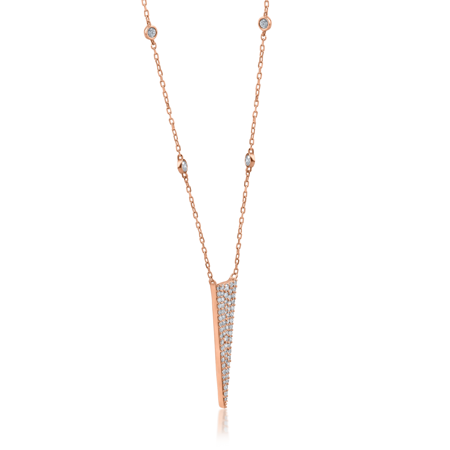 Acest lanț cu pandantiv geometric din aur roz cuprinde diamante de 0.54ct, ce reflectă un echilibru între strălucirea pietrelor și căldura metalului prețios.