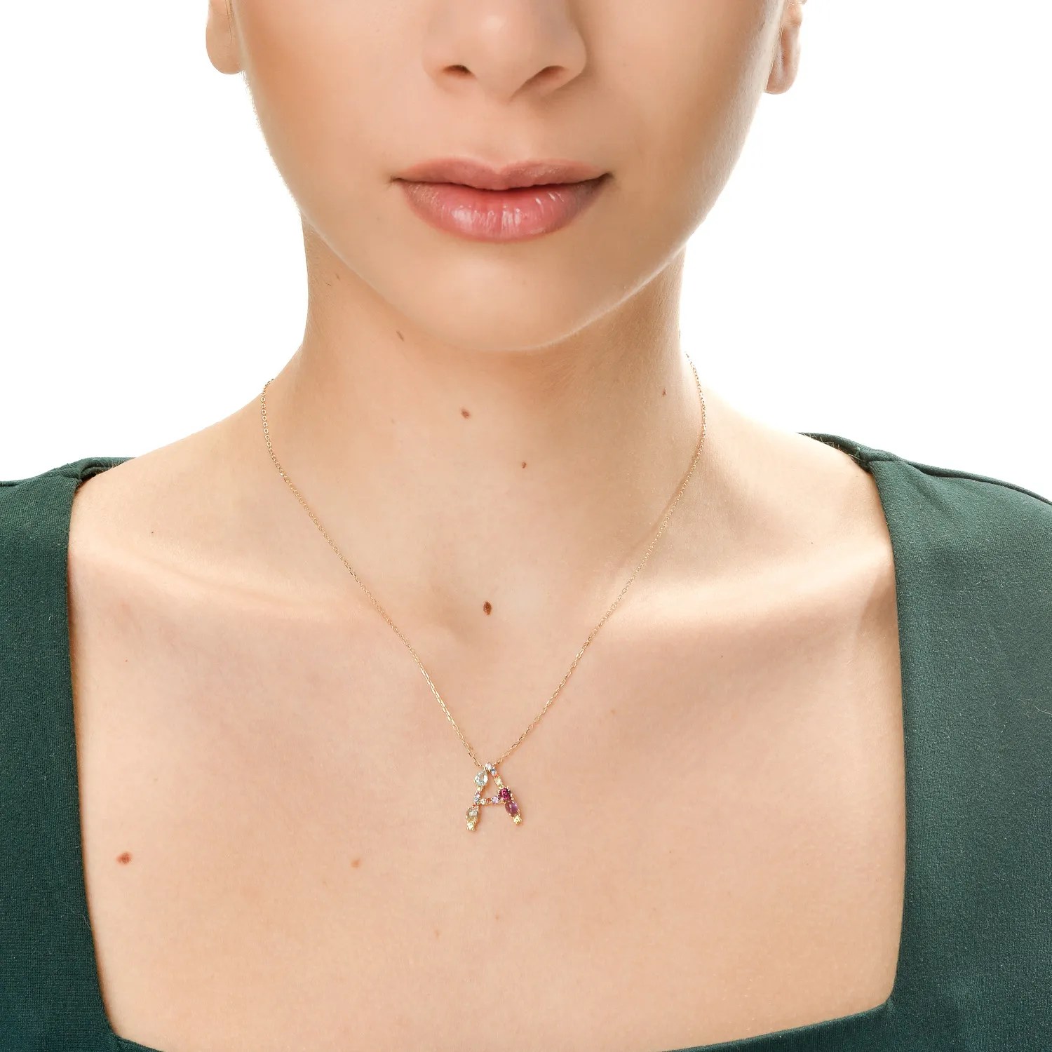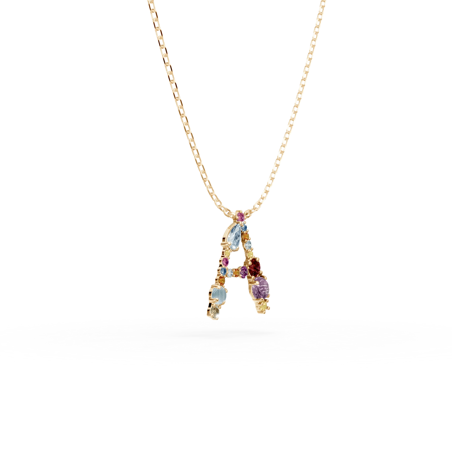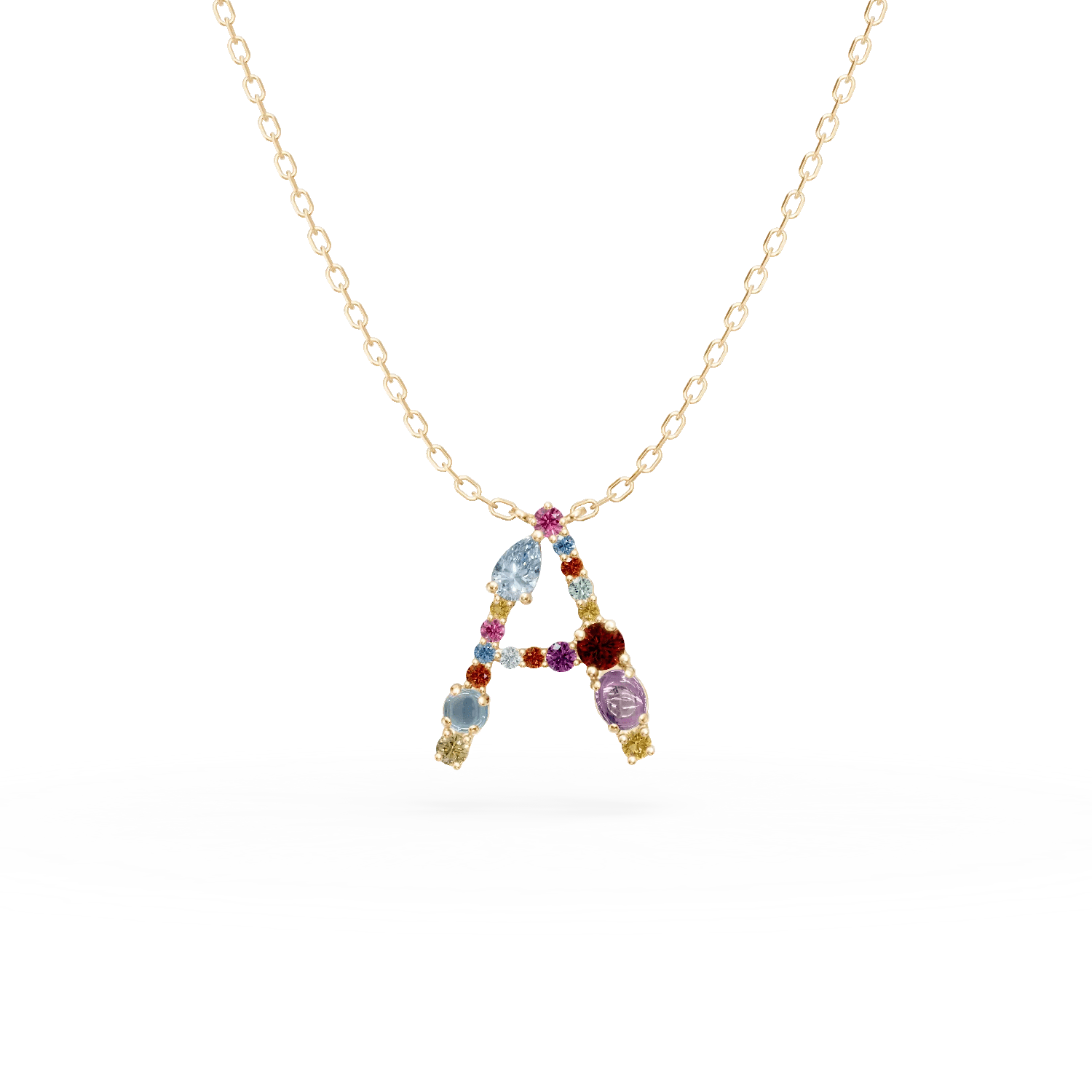 Completează-ţi stilul cu acest lanţ din aur galben, având un pandantiv în forma literei A. Designul său elegant combină strălucirea aurului cu pietrele preţioase şi semipreţioase de 1ct, oferind o compoziţie armonioasă. Fiecare piatră este amplasată cu atenţie pentru a crea un efect vibrant de culori.