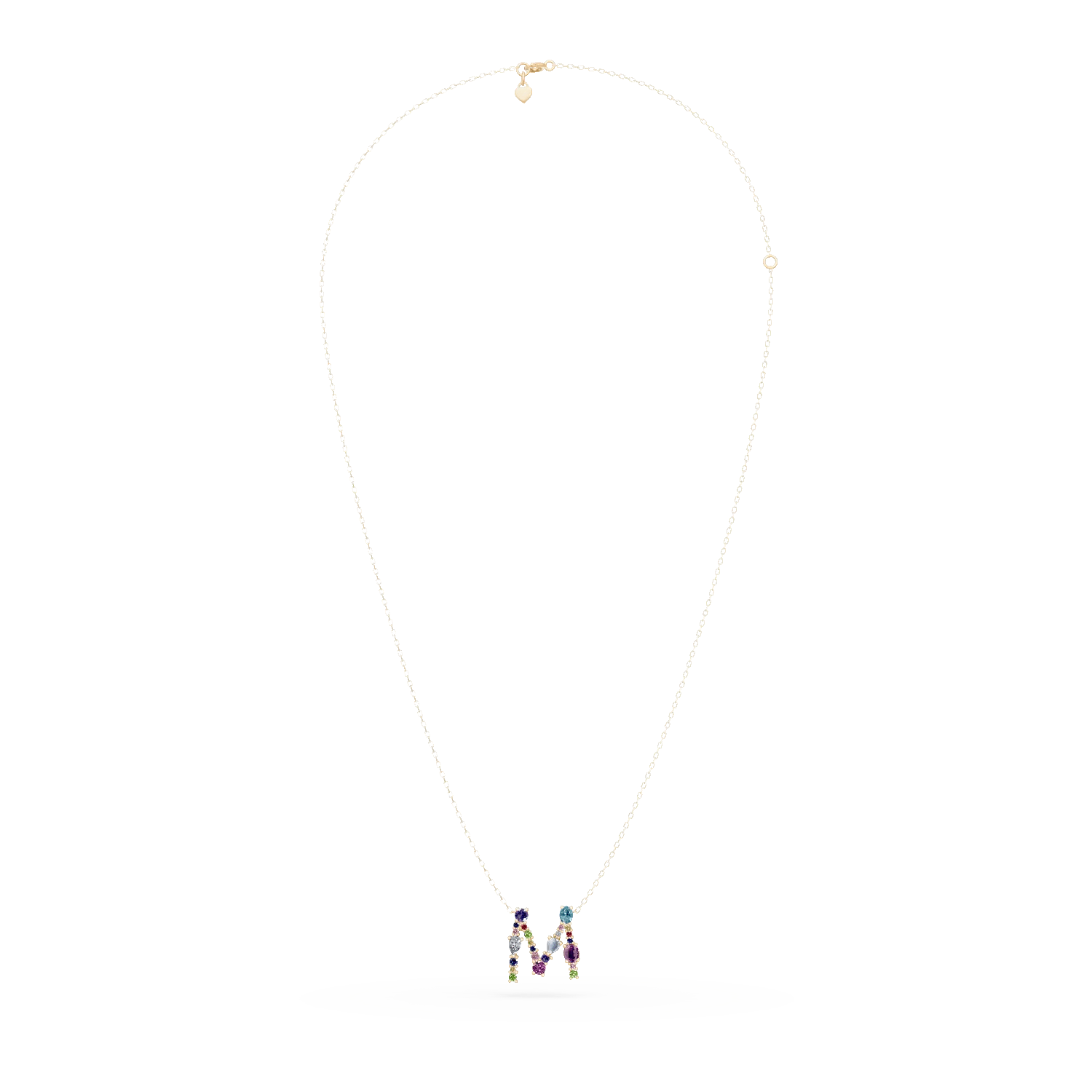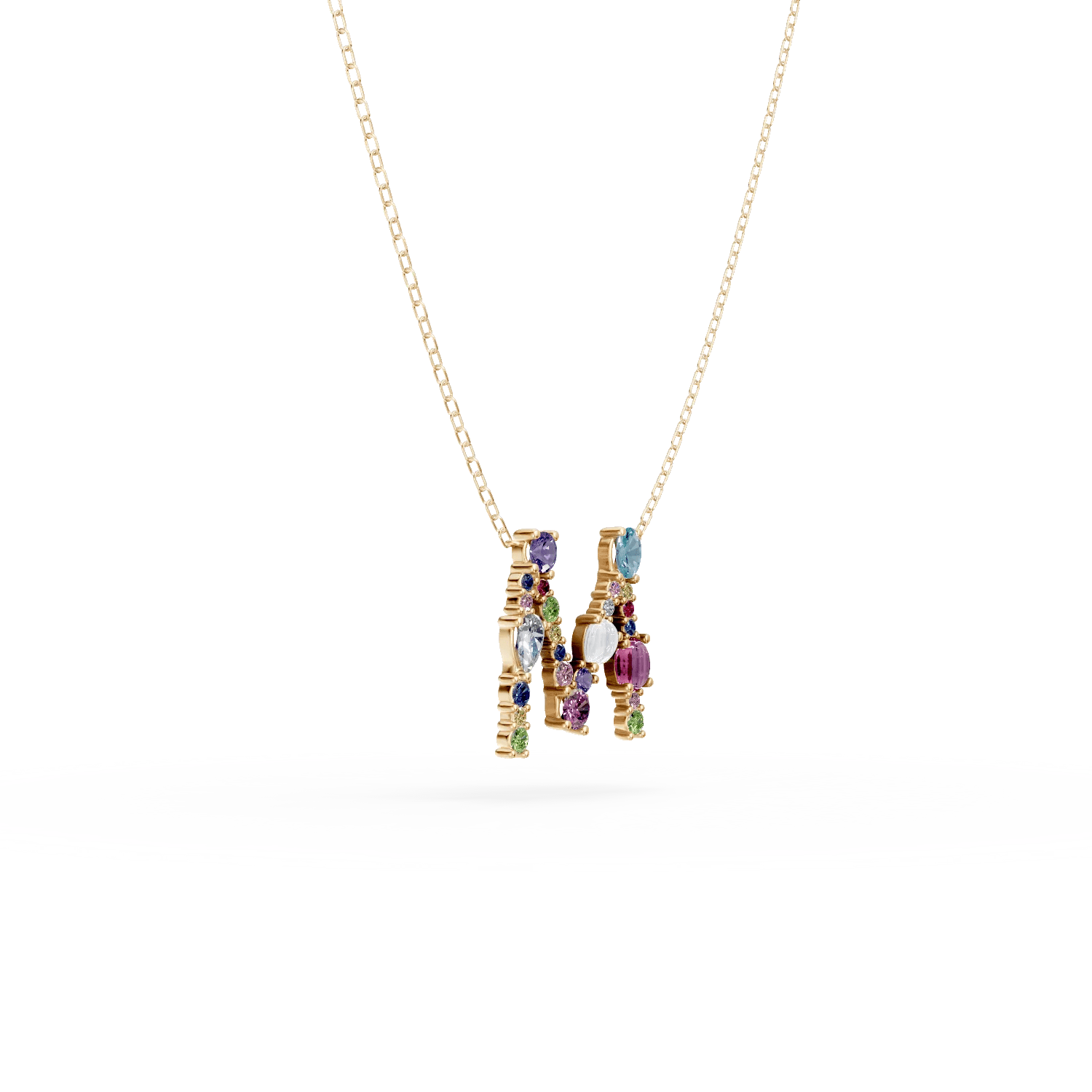 Poartă cu încredere un lanț din aur galben, cu un pandantiv sofisticat în forma literei M. Pietrele prețioase și semiprețioase, de 1.5ct, sunt selectate cu grijă pentru un efect vizual impresionant și montate cu precizie. Este o bijuterie care îmbină eleganța clasică cu un stil modern și expresiv, potrivită pentru orice ocazie.