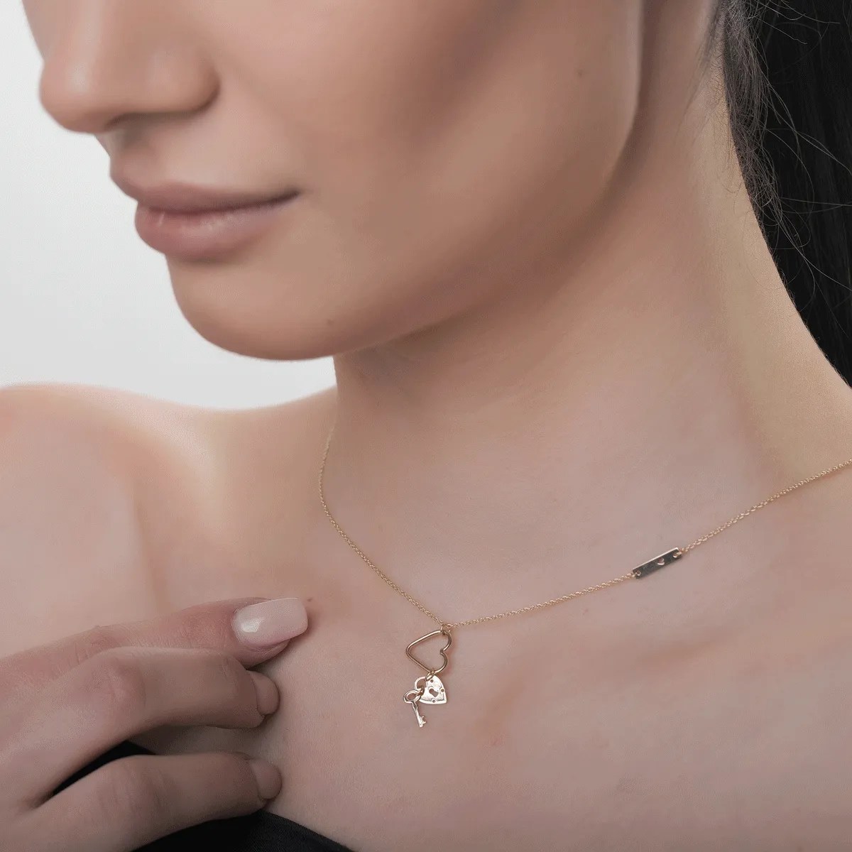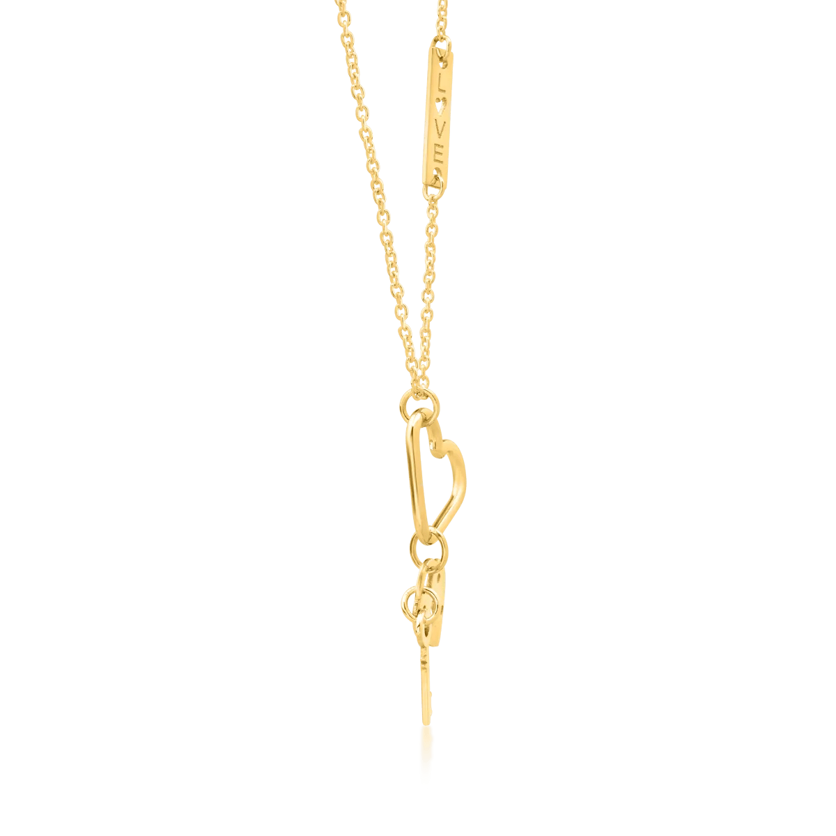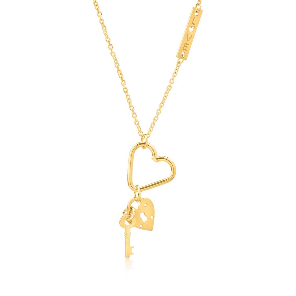 Completează-ți ținuta elegantă cu un accesoriu care atrage privirile. Detaliile elegante ale acestui lanț cu pandantive inimi, lăcățel și cheiță din aur galben îl transformă în piesa centrală a unui look sofisticat. Explorează bijuteriile TEILOR și alege-ți favorita.