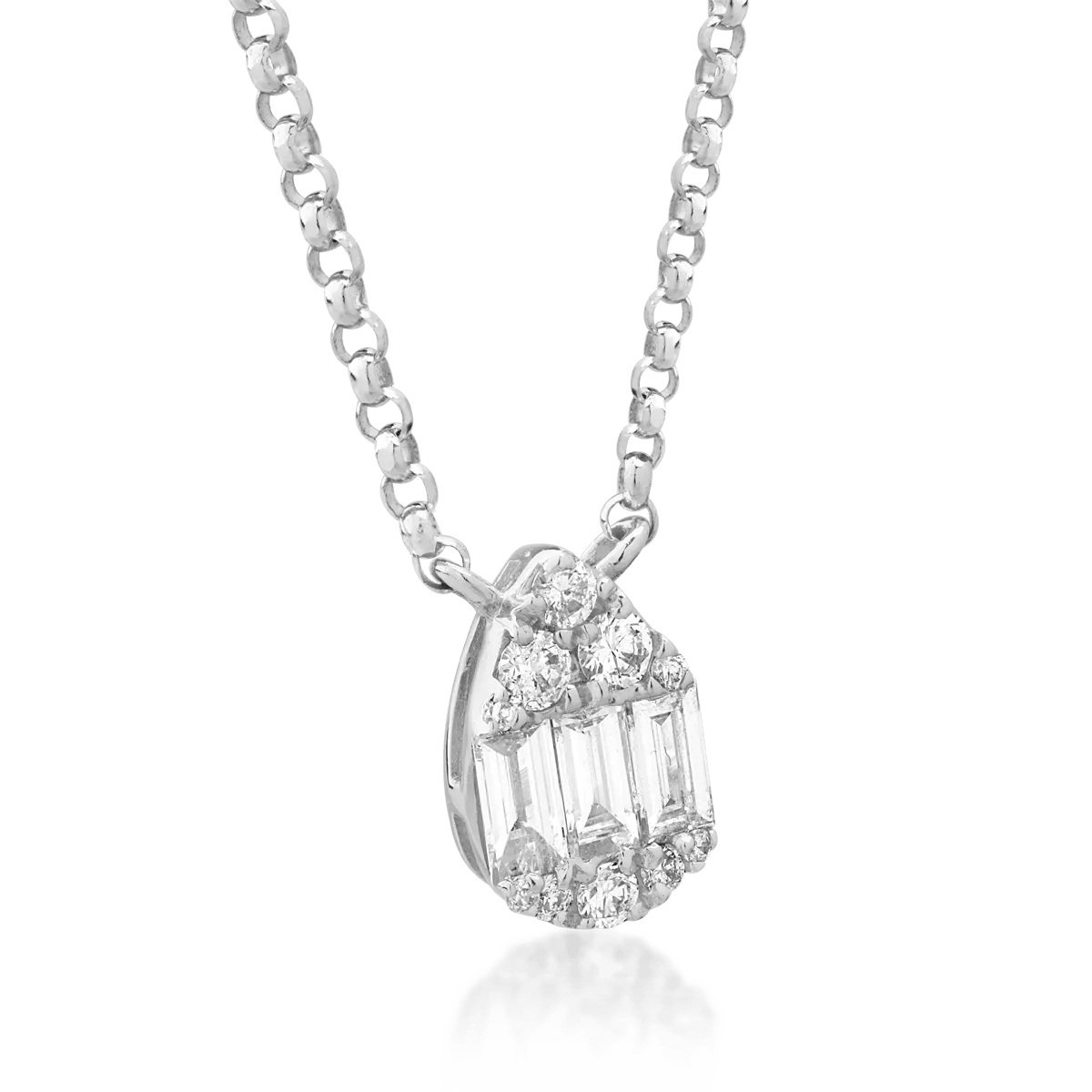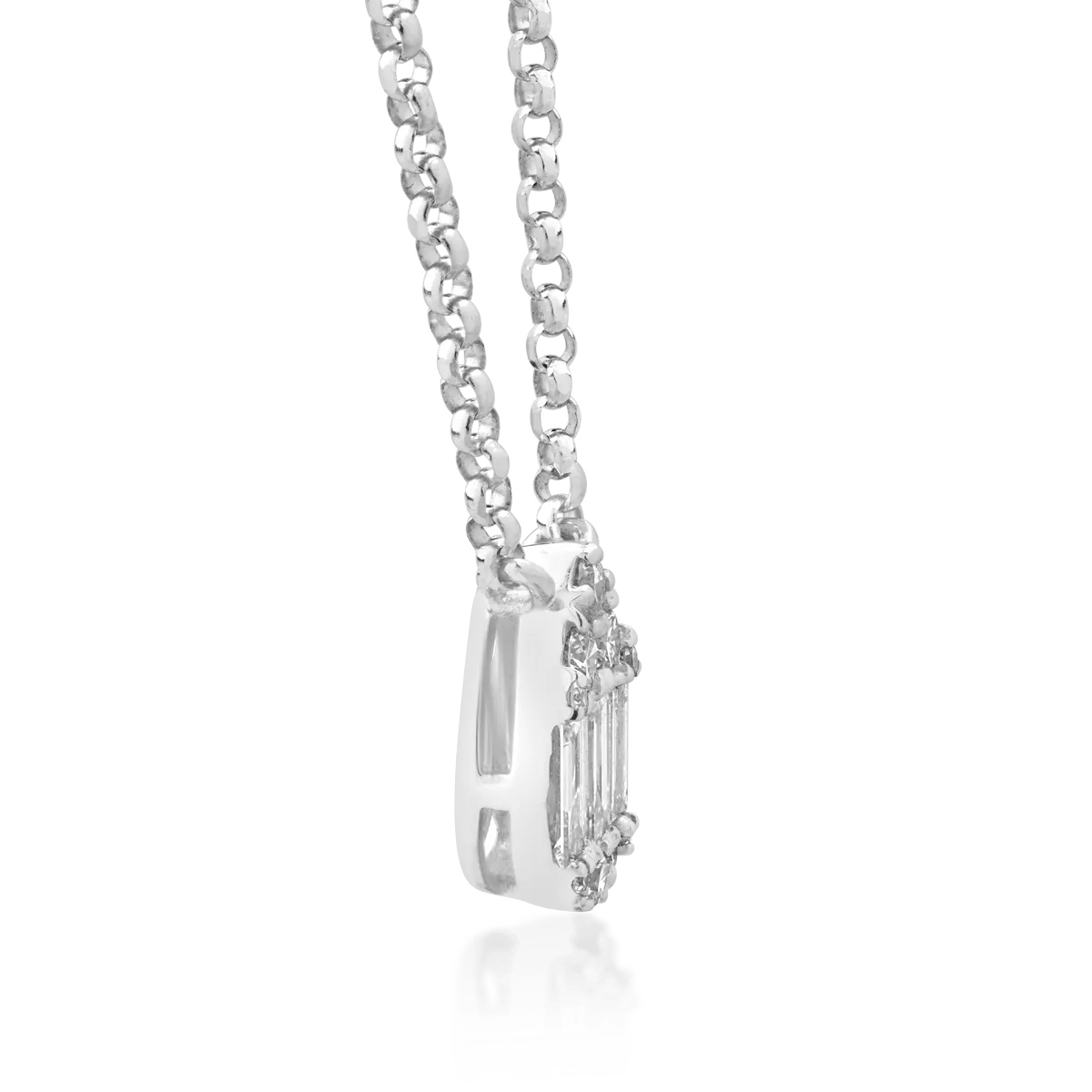Descoperă eleganța acestui lanț cu pandantiv din aur alb, împodobit cu diamante baguette și rotunde totalizând 0.18ct. Detaliile fine și pietrele alungite oferă un aer modern, în timp ce diamantele rotunde aduc un plus de strălucire. Ideal pentru cei care apreciază designul simplu și echilibrat.