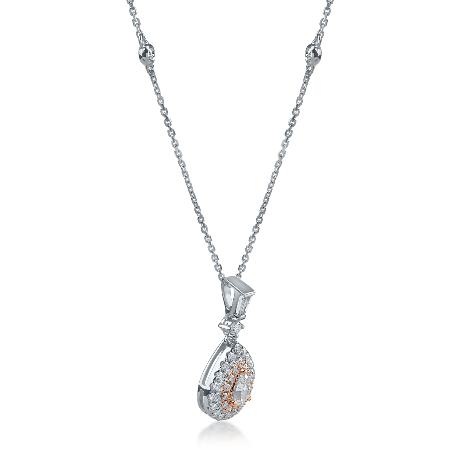 Descoperă eleganța acestui lanț sofisticat din aur alb-roz, împodobit cu diamante roz în tăietură pear și rotundă de 0.4ct, alături de diamante incolore baguette și rotunde de 0.4ct. Combinația de aur în două nuanțe și pietre prețioase adaugă un plus de stil și rafinament fiecărei ținute.