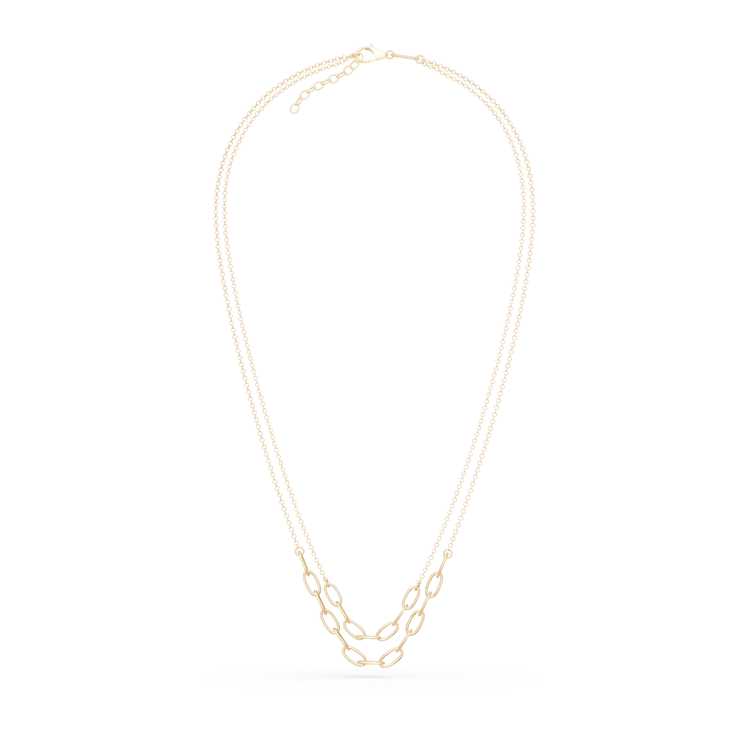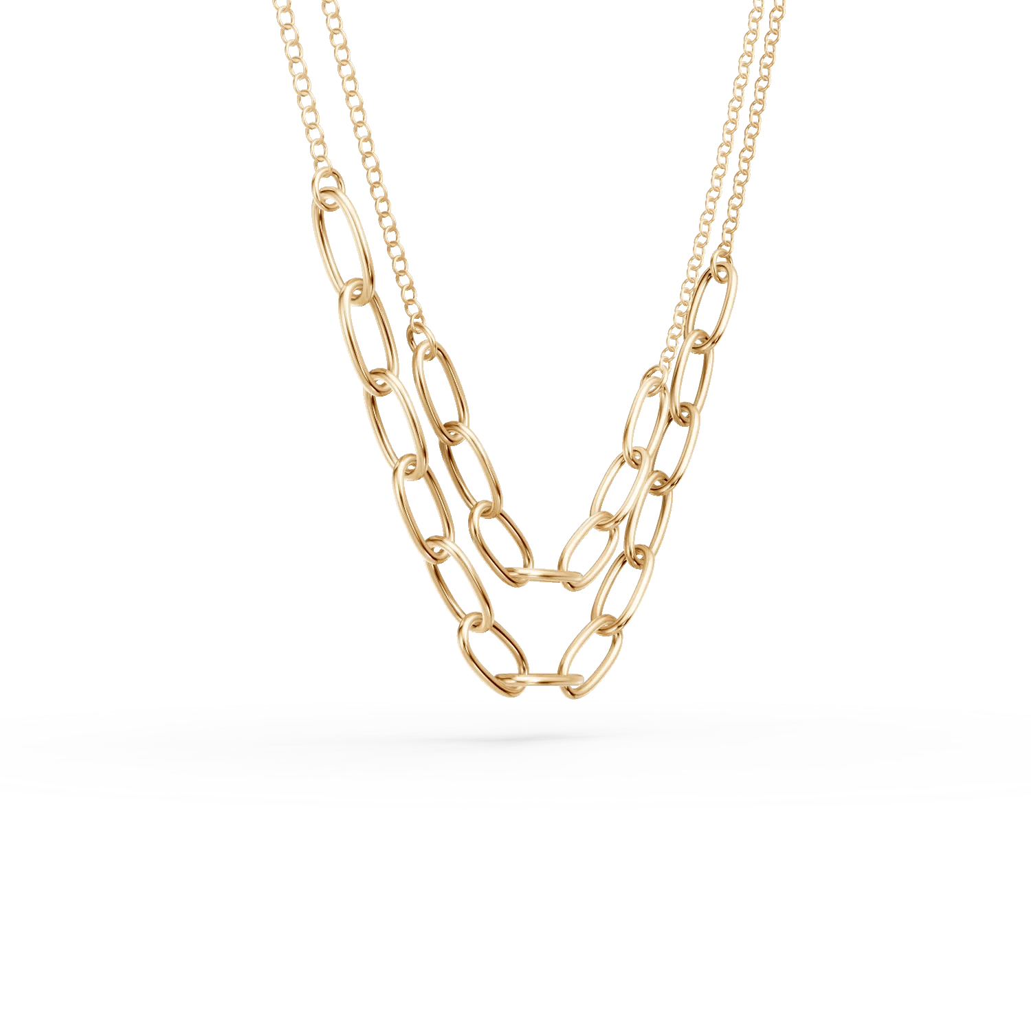 Acest lanț dublu din aur galben reunește un stil clasic cu un design modern și adaptabil. Cele două șiruri delicate sunt îmbogățite cu zale fine, lucrate meticulos, adăugând textură și eleganță. Strălucirea caldă a aurului pune în evidență liniile clare, făcând din această bijuterie un accesoriu ideal de purtat singură sau alături de alte coliere. Perfect pentru ținute casual elegante sau apariții rafinate.