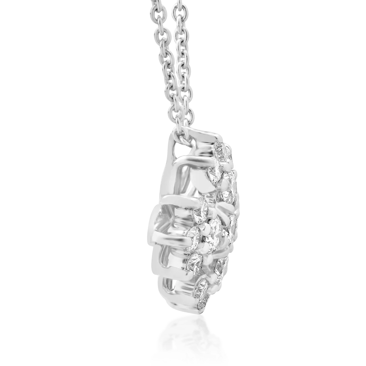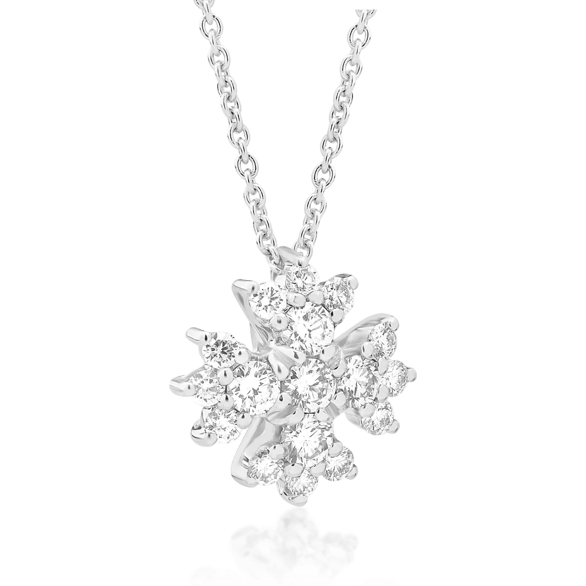 Lanțul și pandantivul din aur alb cu diamante de 0.58ct combină frumusețea pietrelor prețioase cu eleganța metalului nobil. Designul rafinat și detaliile fine oferă un aspect sofisticat, ideal pentru a evidenția frumusețea naturală. Fiecare diamant este atent lucrat pentru a capta lumina într-un mod subtil. Acesta poate transforma o ținută simplă într-una remarcabilă.