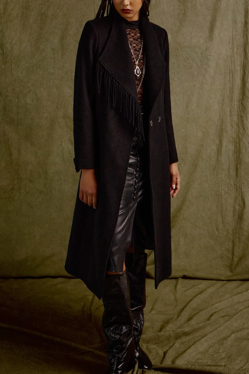Palton elegant, cu un design simplu și fără închidere frontală. Dispune de căptușeală internă și butoane duble pentru fixare.
