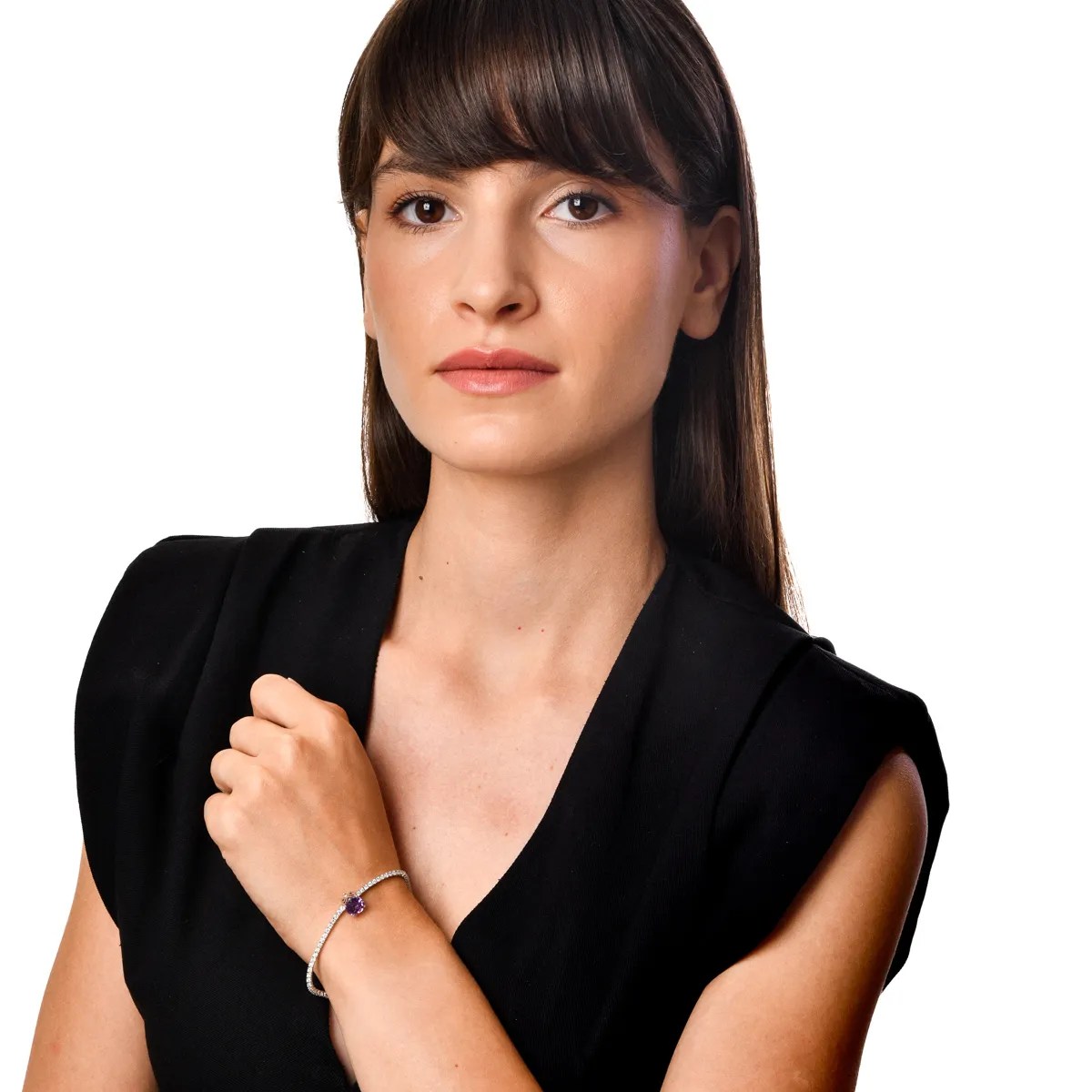 Acest pandantiv minimalist din aur alb, cu ametist de 1.8ct, se remarcă prin culoarea sa intensă și strălucirea naturală. Pietrele sunt șlefuite pentru a captura lumina într-un mod aparte, adăugând o eleganță discretă oricărei brățări.