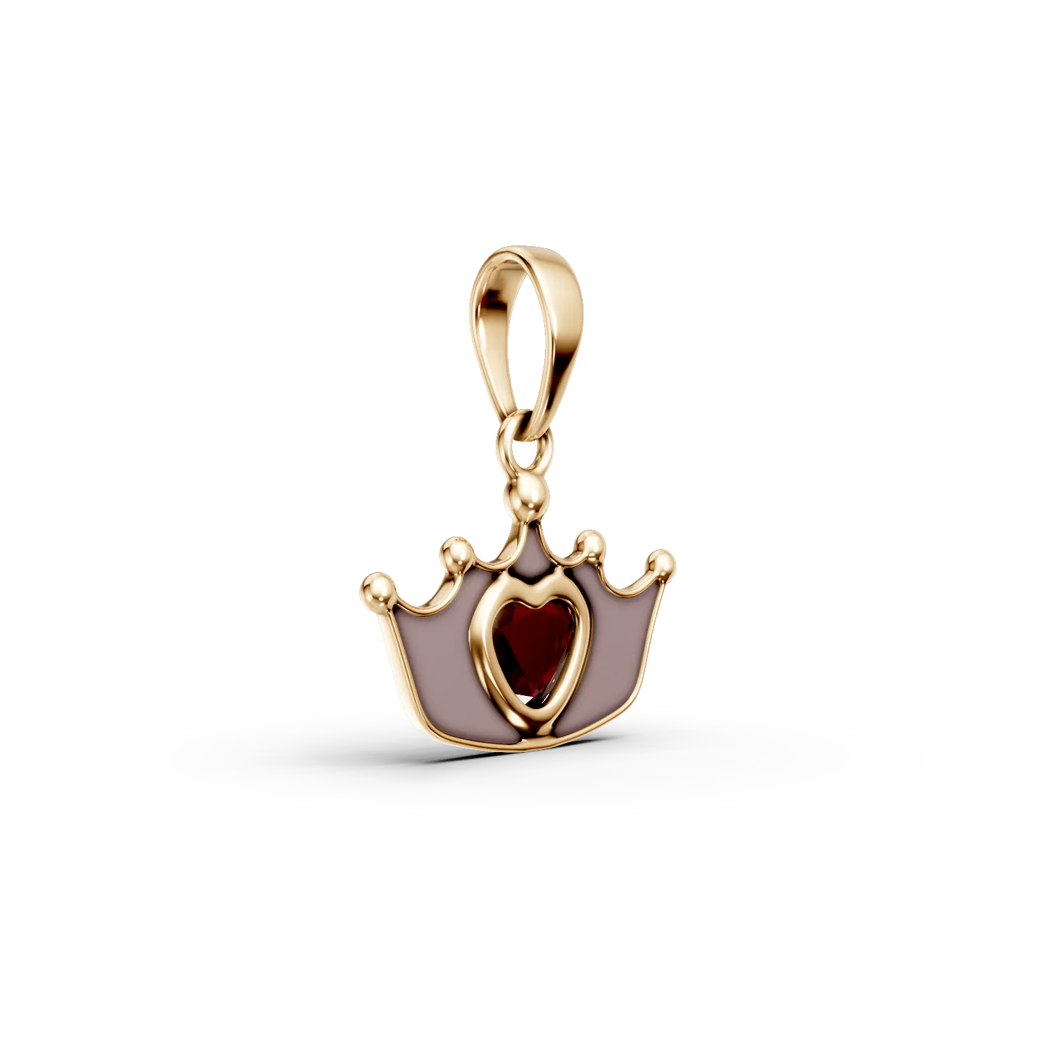 Acest pandantiv deosebit combină o coroană din aur galben cu un granat în formă de inimă de 0.1ct. Creat special pentru copii, adaugă un stil regal și elegant. Designul este delicat și confortabil, evocând puterea și imaginația micilor visători. Granatul roșu oferă un luciu subtil și căldură.