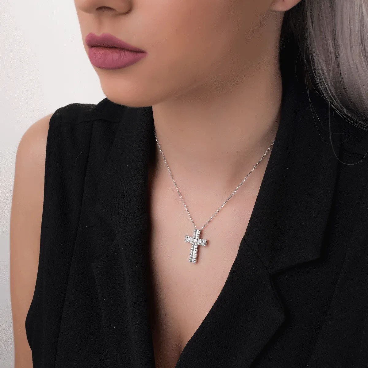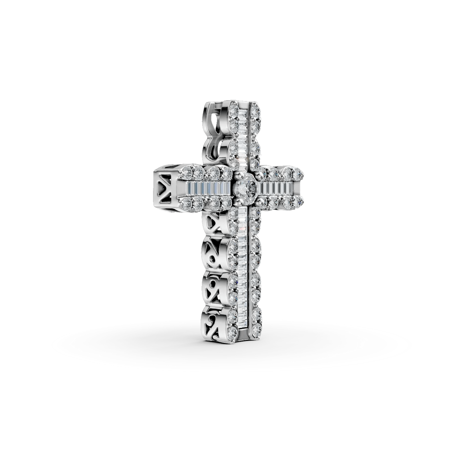 Acest pandantiv din aur alb, decorat cu diamante baguette și rotunde de 0.88ct, aduce un plus de eleganță și rafinament. Designul său impresionant reflectă lumina într-un mod spectaculos, evidențiind strălucirea naturală. Alege să îl porți cu un lanț pentru a descoperi frumusețea detaliilor fine.