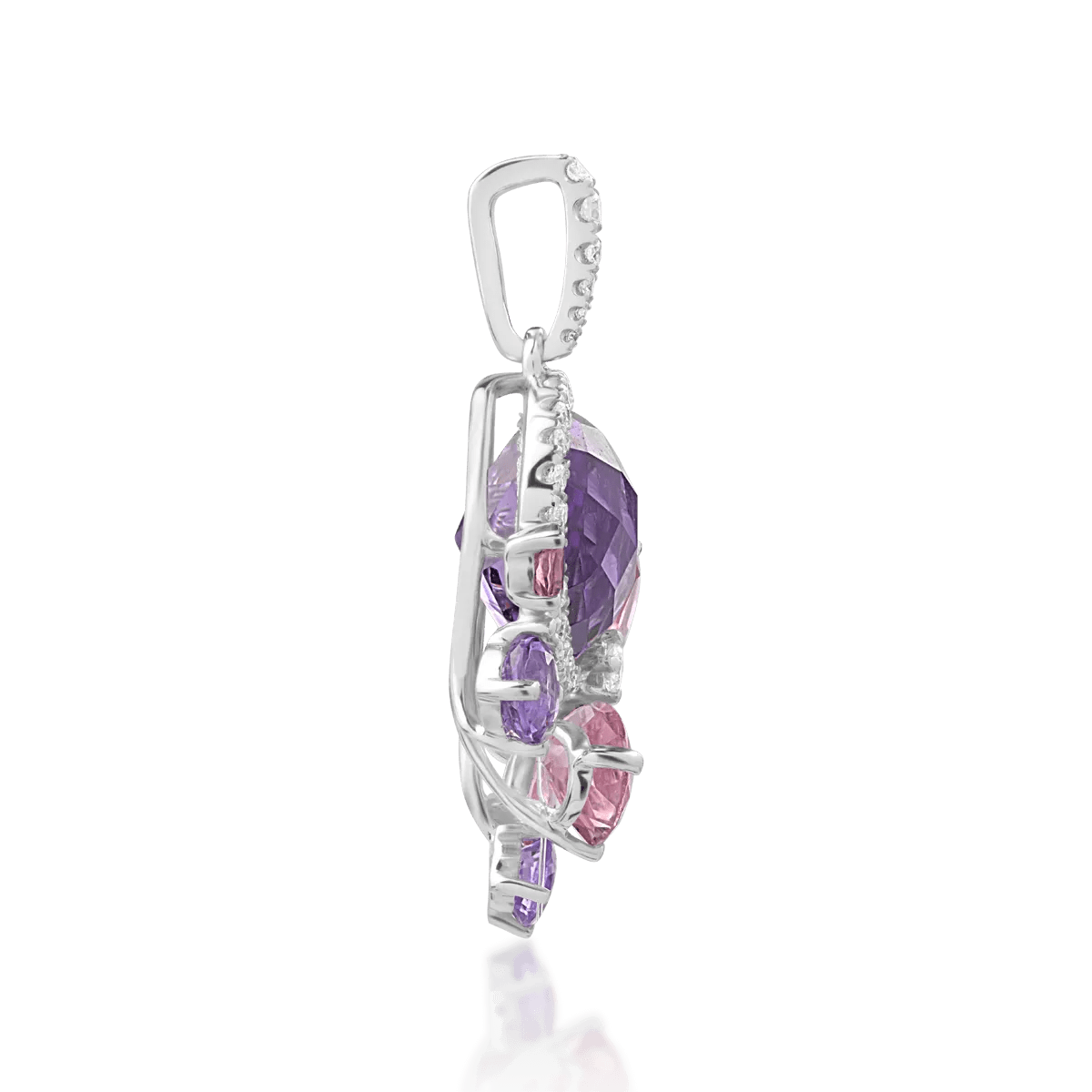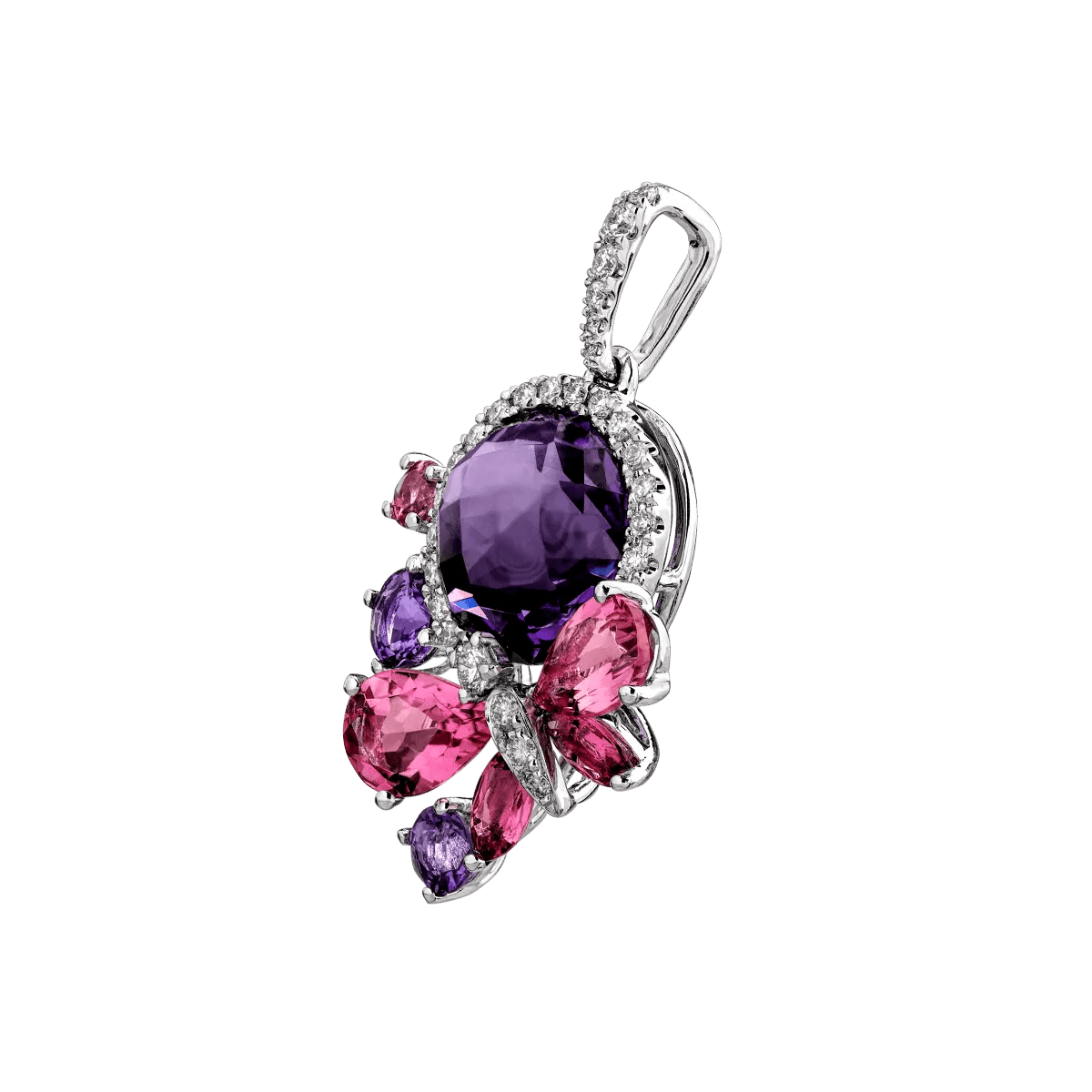 Pandantivul din aur alb integrează pietre prețioase și semiprețioase de 6.9ct, combinând ametiste și turmaline roz în tăieturi pear, marquise și rotunde. Brilianța discretă a diamantelor îi oferă un plus de rafinament, transformându-l într-un simbol al eleganței.