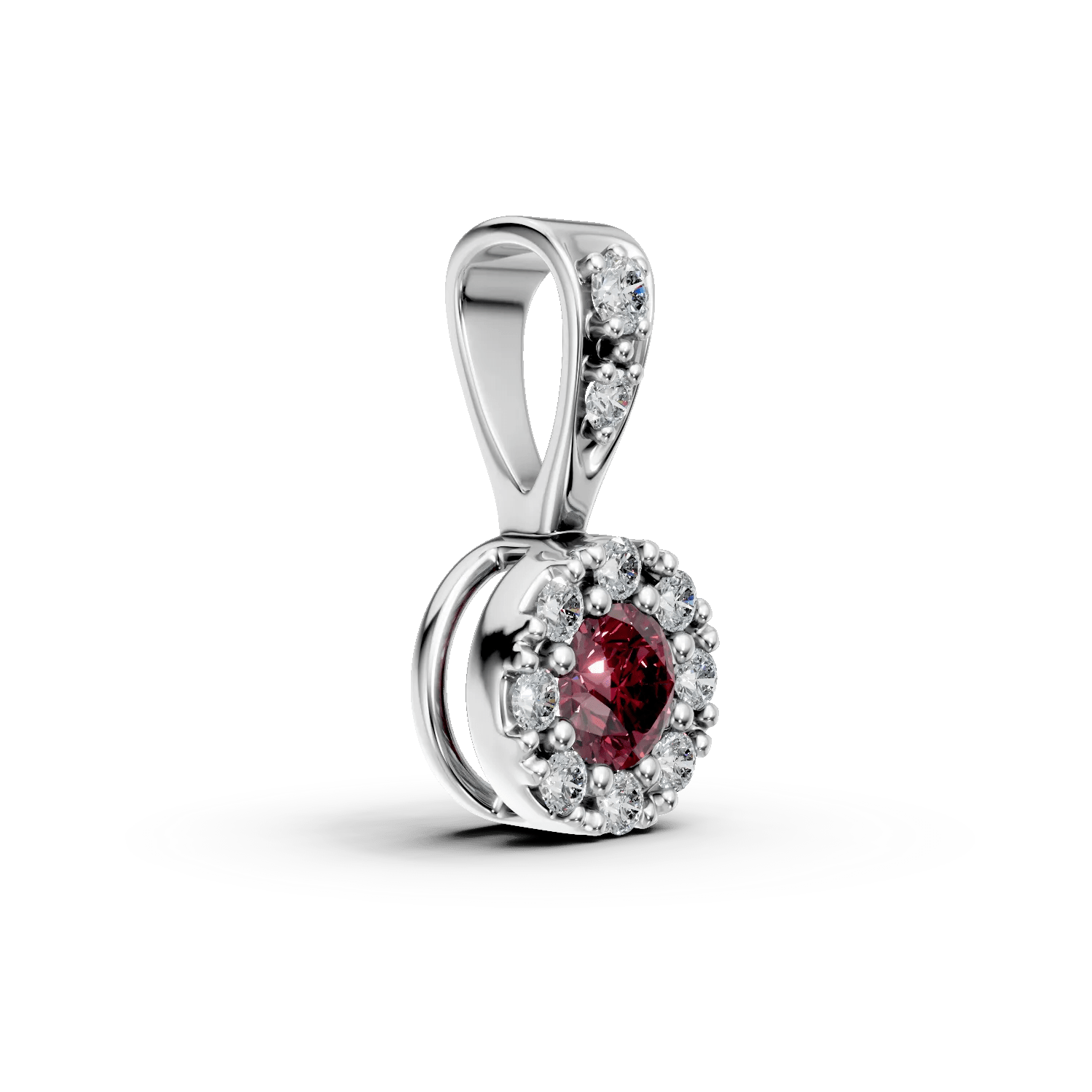 Acest pandantiv rafinat din aur alb, încrustat cu un rubin de 0.07ct și diamante de 0.06ct, emană eleganță și rafinament. Combinarea strălucirii rubinului cu luciul aurului alb și sclipirea diamantelor conferă un farmec special fiecărui moment. Ideal pentru femeia care îi apreciază detaliile.