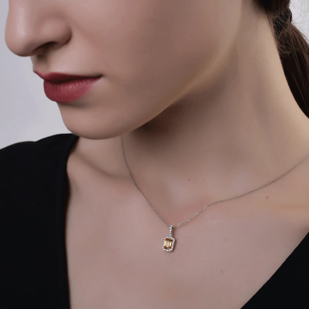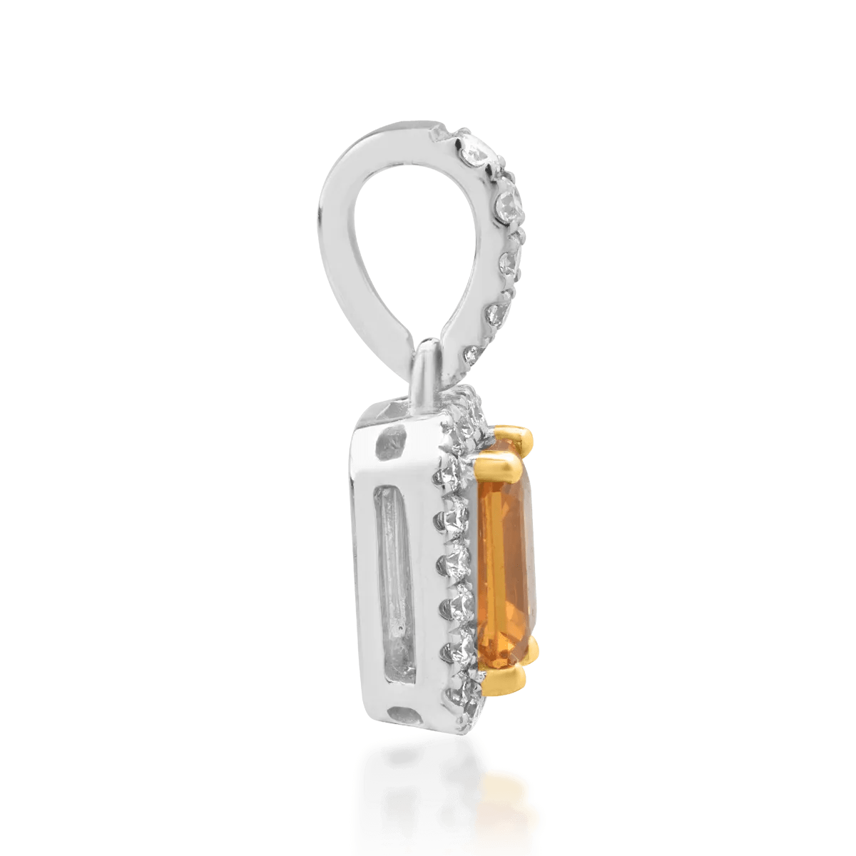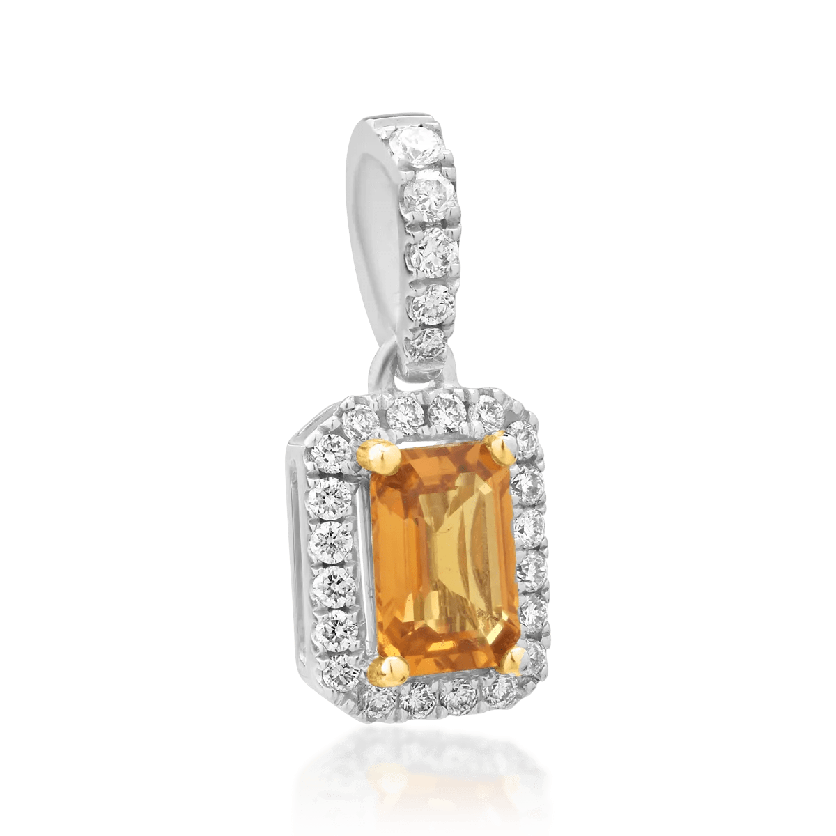Pandantivul realizat din aur alb, împodobit cu un safir galben rectangular de 0.55ct și diamante de 0.16ct, oferă un aer sofisticat și modern. Contrastul dintre strălucirea aurului alb și nuanțele calde ale safirului creează un efect vizual deosebit, fiind ideal pentru a completa orice ținută cu eleganță.
