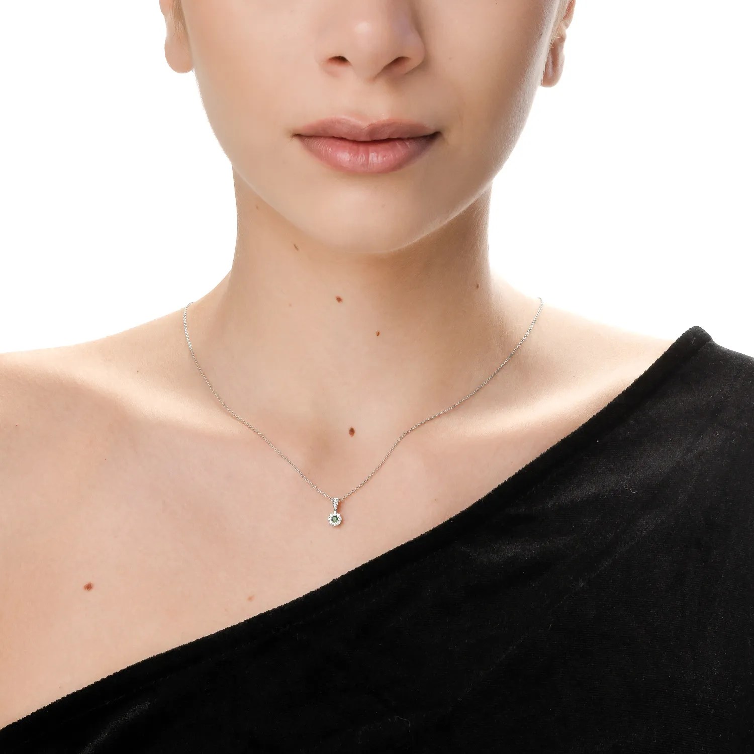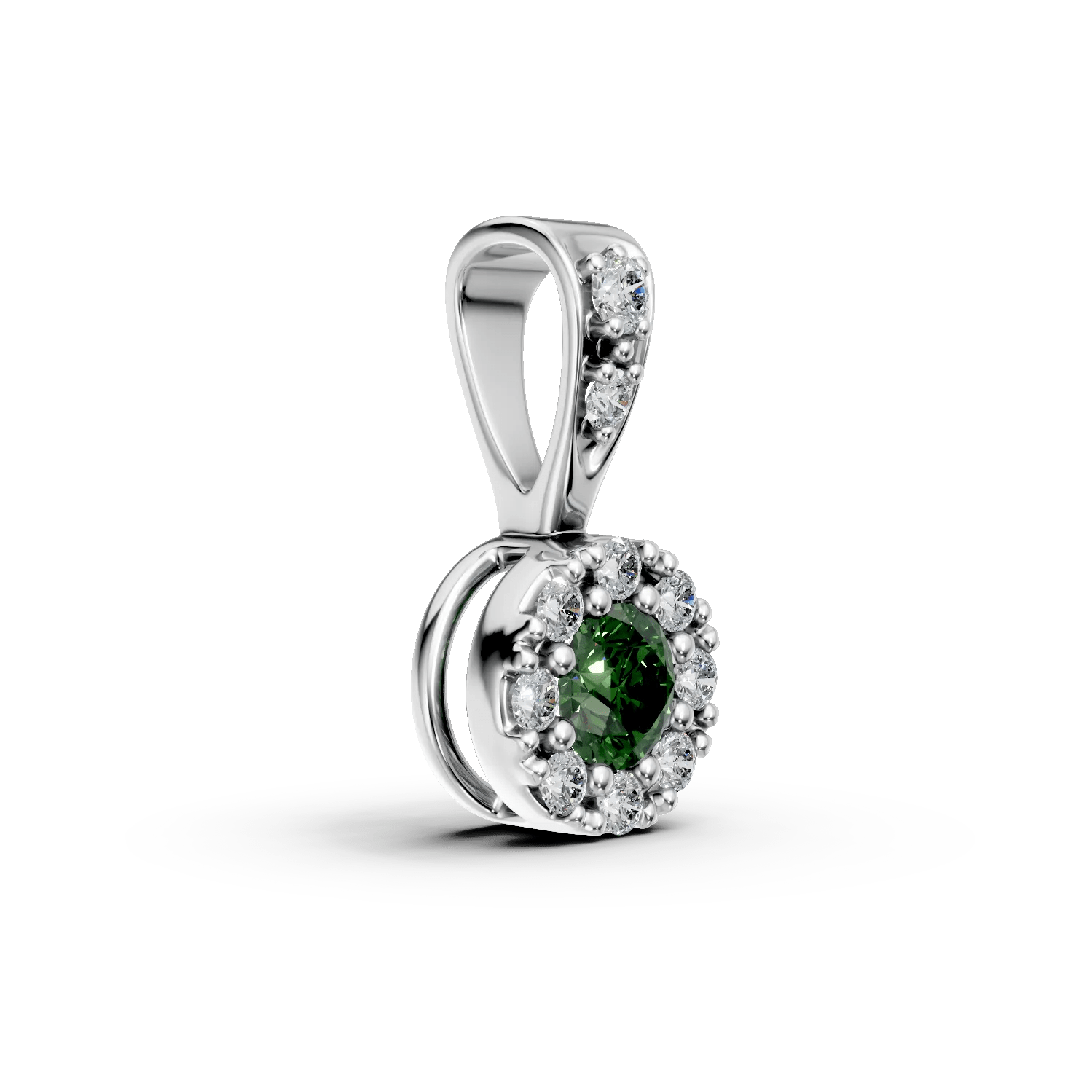 Acest pandantiv din aur alb, având ca element central un smarald de 0.06ct, este accentuat de diamante de 0.05ct, creando un contrast elegant între intensitatea smaraldului și strălucirea subtilă a diamantelor. Designul rafinat și montura bine definită pun în valoare frumusețea pietrei centrale, iar finisajele precise adaugă o notă sofisticată. Este o alegere ideală pentru a evidenția stilul tău.