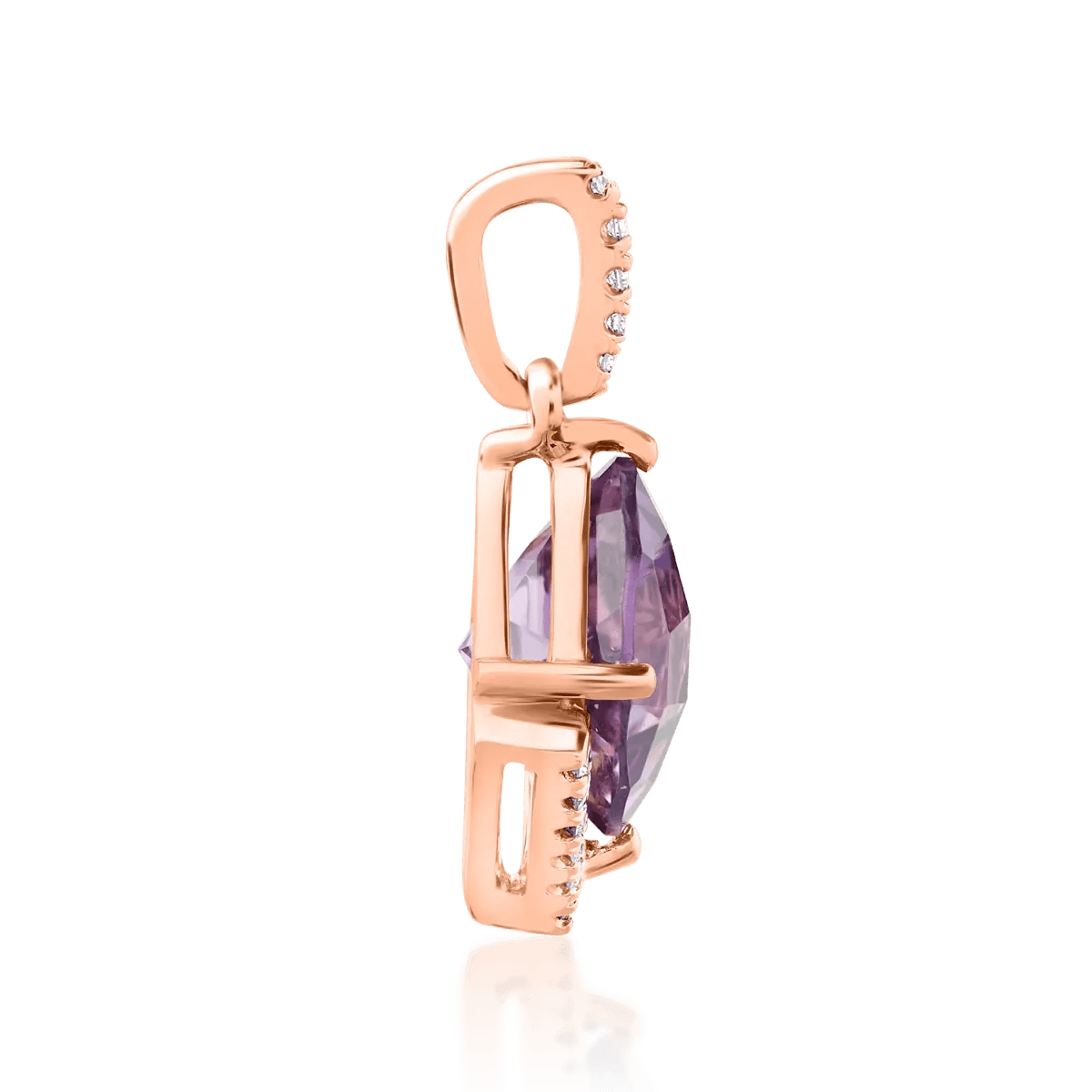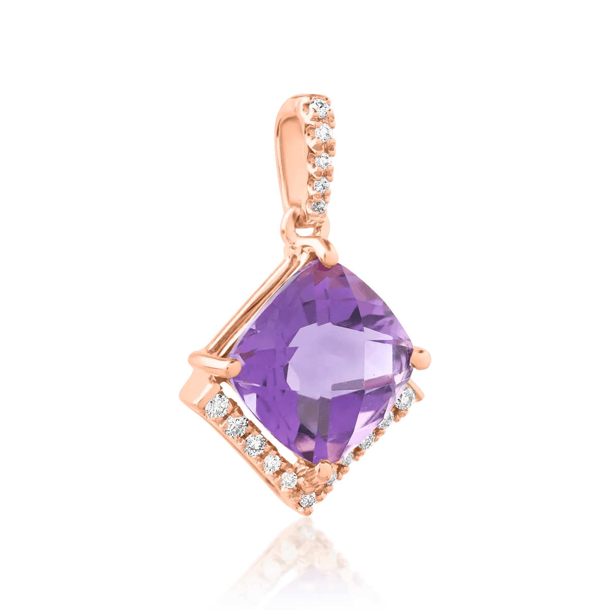Acest pandantiv din aur roz combină sofisticat nuanțele violet ale ametistului cushion de 2.3ct cu strălucirea diamantelor de 0.08ct. Taieturile precise ale ametistului captează lumina, în timp ce diamantele oferă un plus de rafinament.