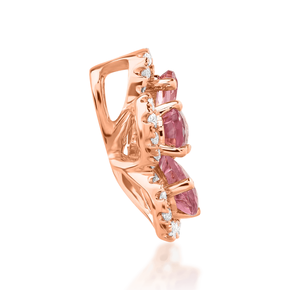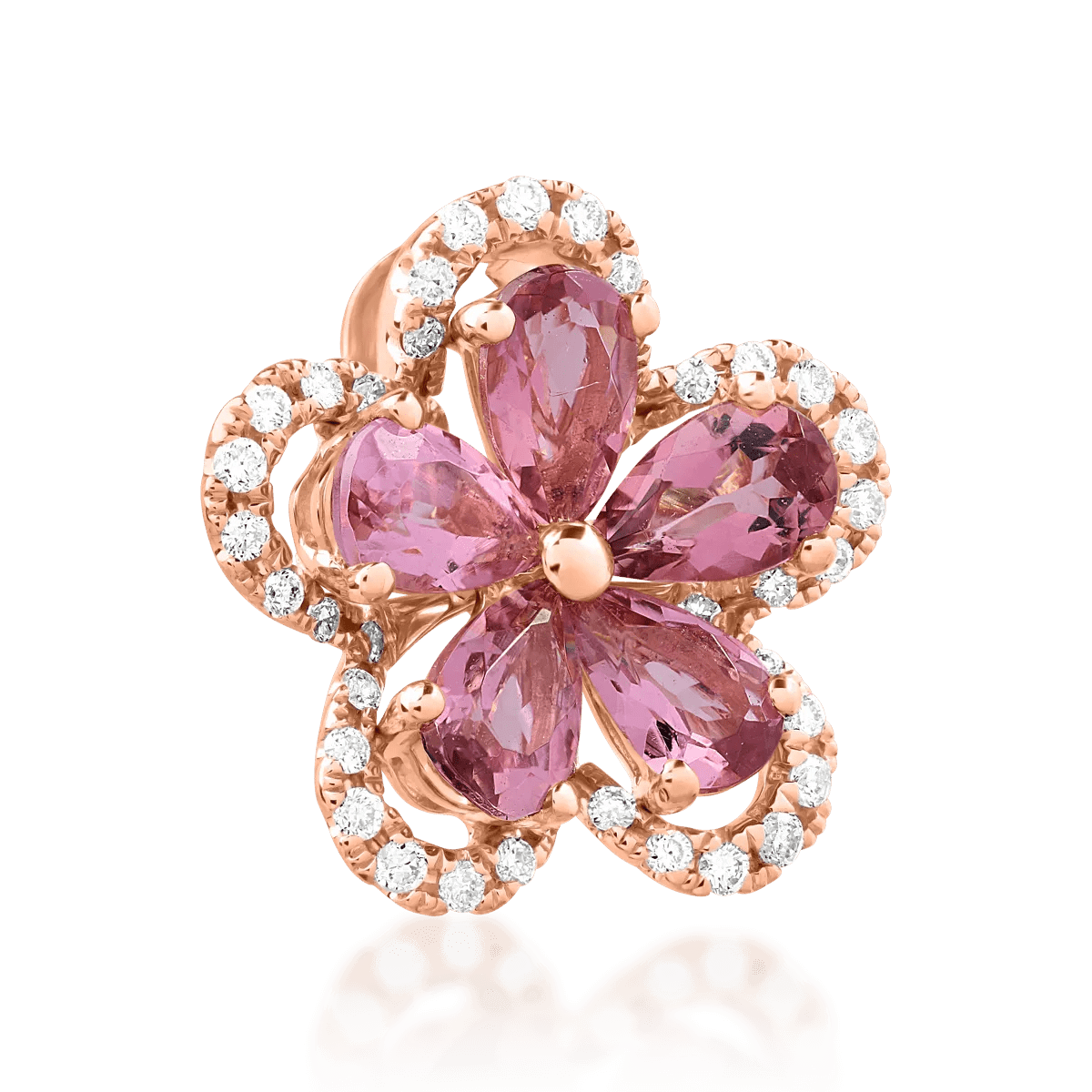 Acest pandantiv din aur roz îmbină eleganța cu modernitatea, având un design floral reinterpretat. Turmalinele roz de 1ct adaugă vibranță, în timp ce diamantele de 0.1ct subliniază rafinamentul piesei.