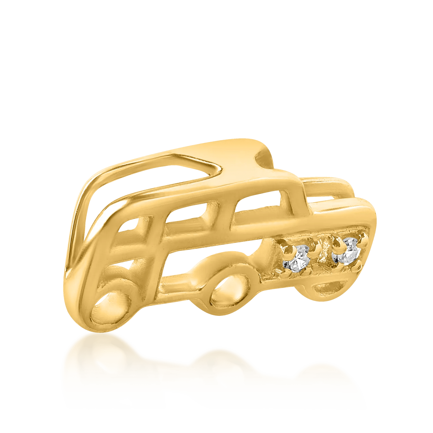 Acest pandantiv unic, în formă de mașinuță, realizat din aur galben cu diamante de 0.008ct, este creat pentru a aduce bucurie copiilor. Designul său jucăuș și armonios combină strălucirea diamantelor cu căldura aurului, aducând o notă de veselie și lumină. Este o bijuterie perfectă pentru cei mici, menită să inspire zâmbete și fericire.