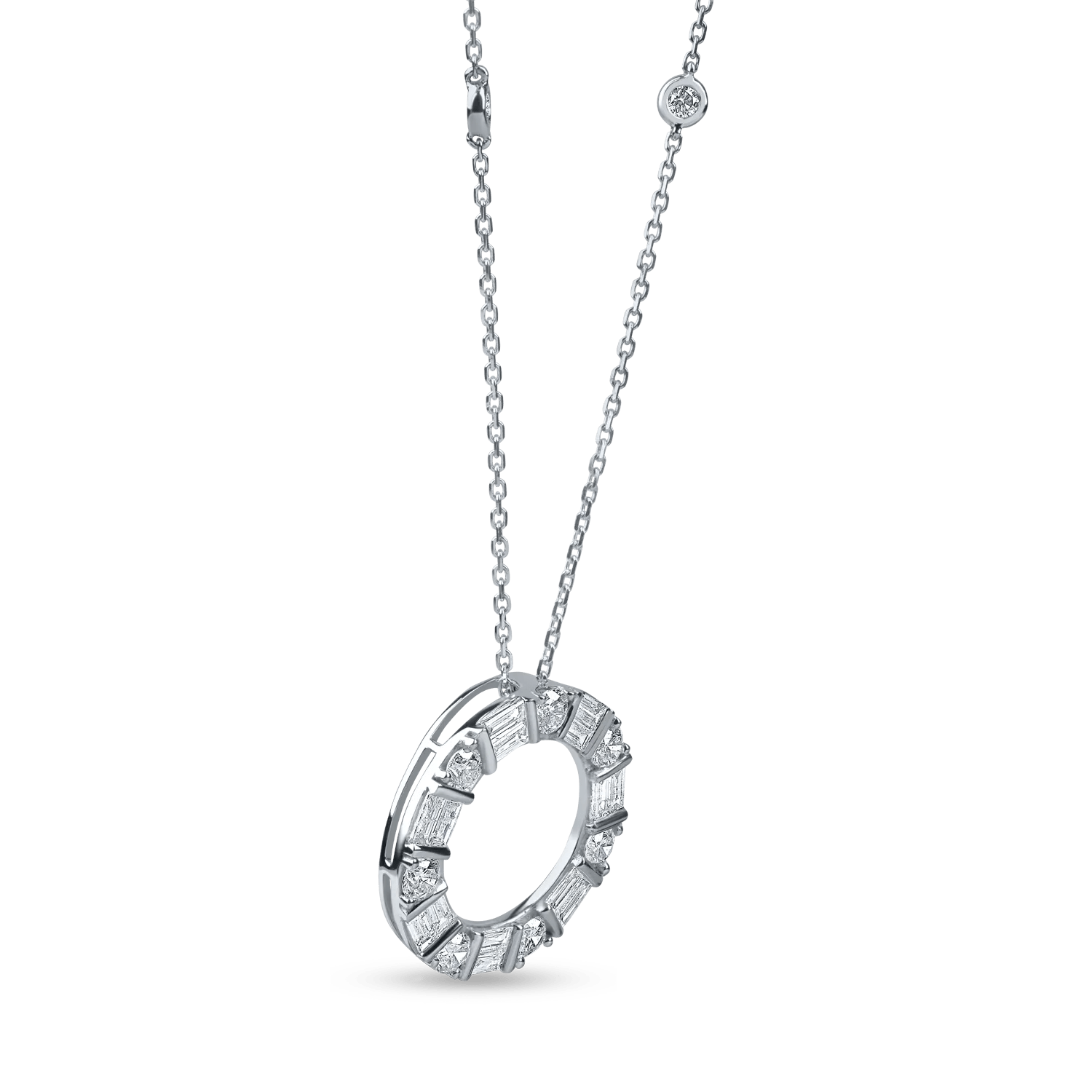 Acest lanț cu pandantiv rotund din aur alb oferă un amestec elegant de diamante baguette și rotunde, totalizând 1ct. Prin combinația dintre tăieturile precise și strălucirea lor subtilă, bijuteria devine un plus de rafinament pentru orice ținută, indiferent dacă este de zi sau de seară. Un accesoriu versatil din colecția TEILOR, simbolizând stilul atemporal.