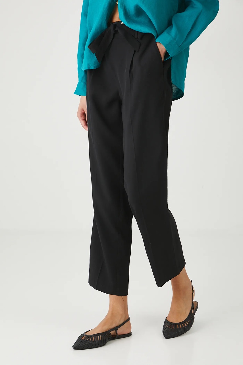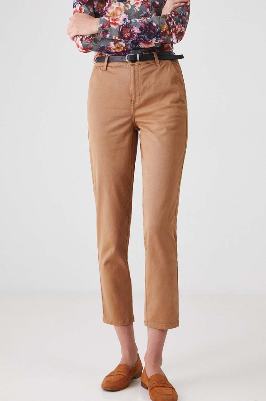 Pantaloni cu stil chino și talie regulată, dotați cu elastic și șnururi pentru ajustare. Buzunarele oblice adaugă funcționalitate și stil.