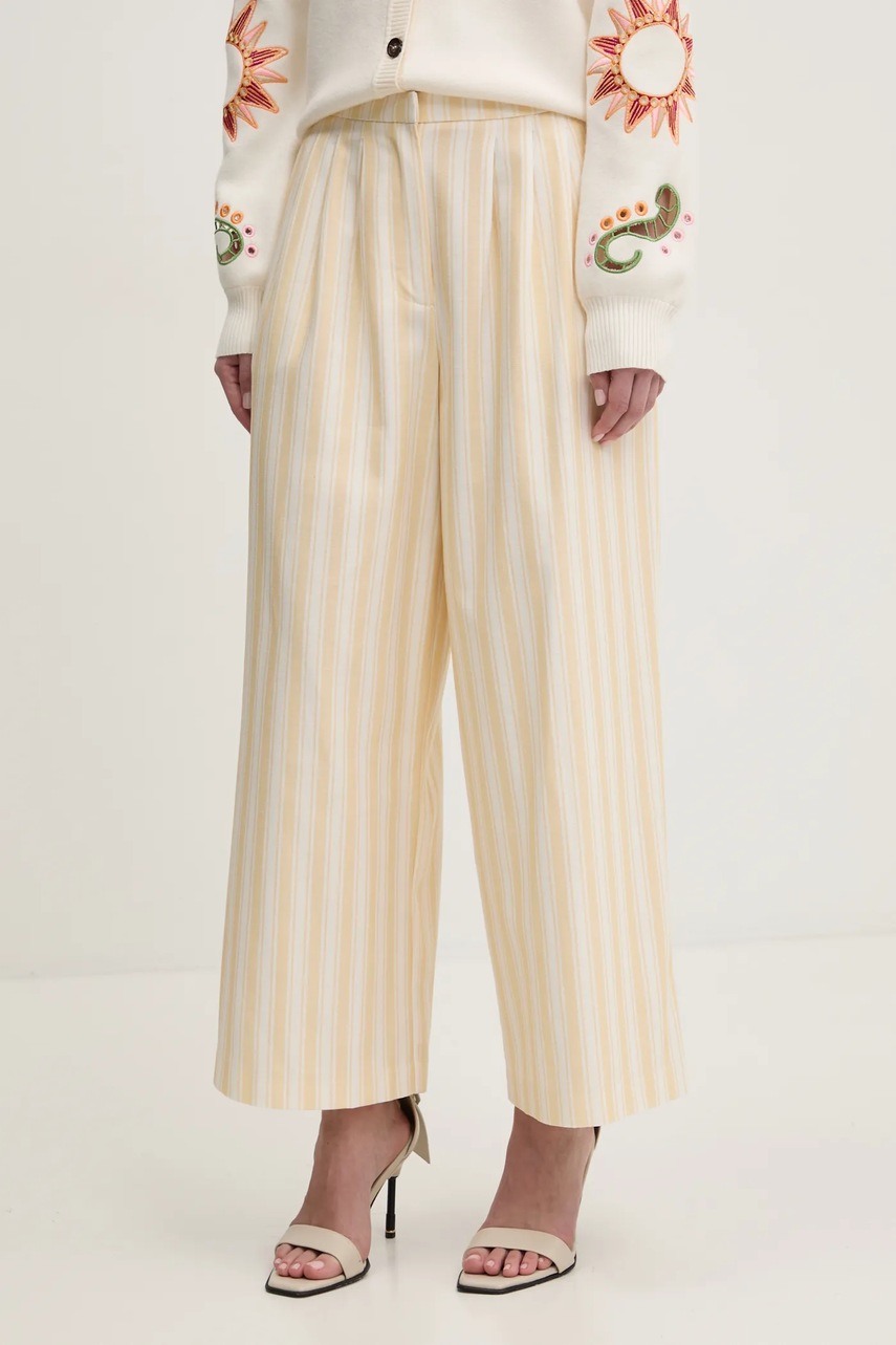 Pantaloni cu croială largă la nivelul șoldurilor și coapselor, având un design cu picior drept pe toată lungimea. Închiderea se realizează cu fermoar, nasture și cârlig, iar talia este înaltă.