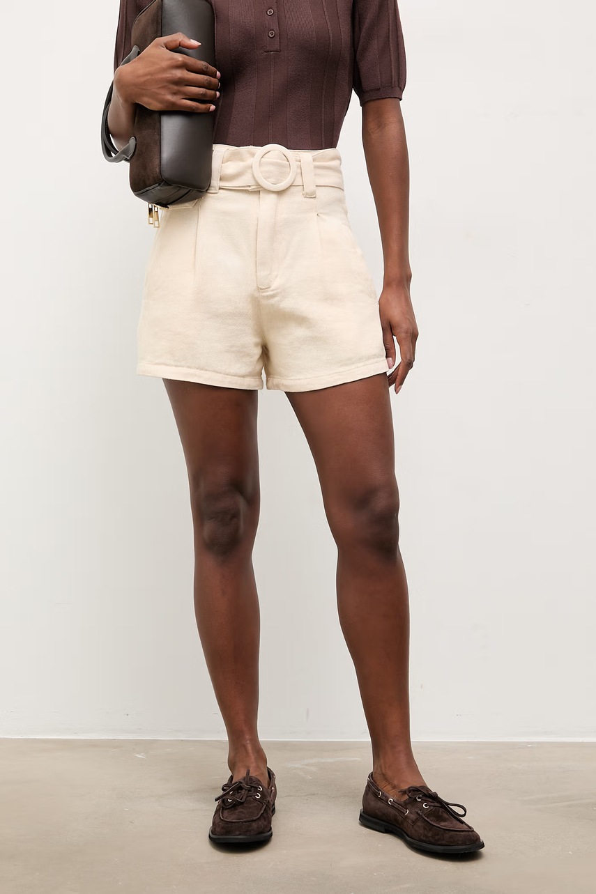 Pantaloni scurți cu talie ridicată și fermoar ascuns, cu un design minimalist și pliuri decorative. Construiți dintr-o stofă subțire și neelastică.