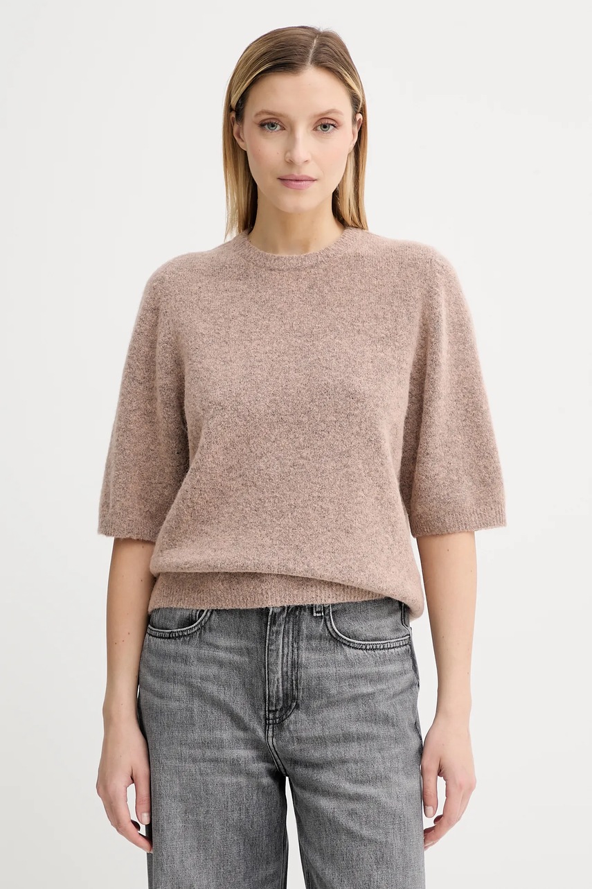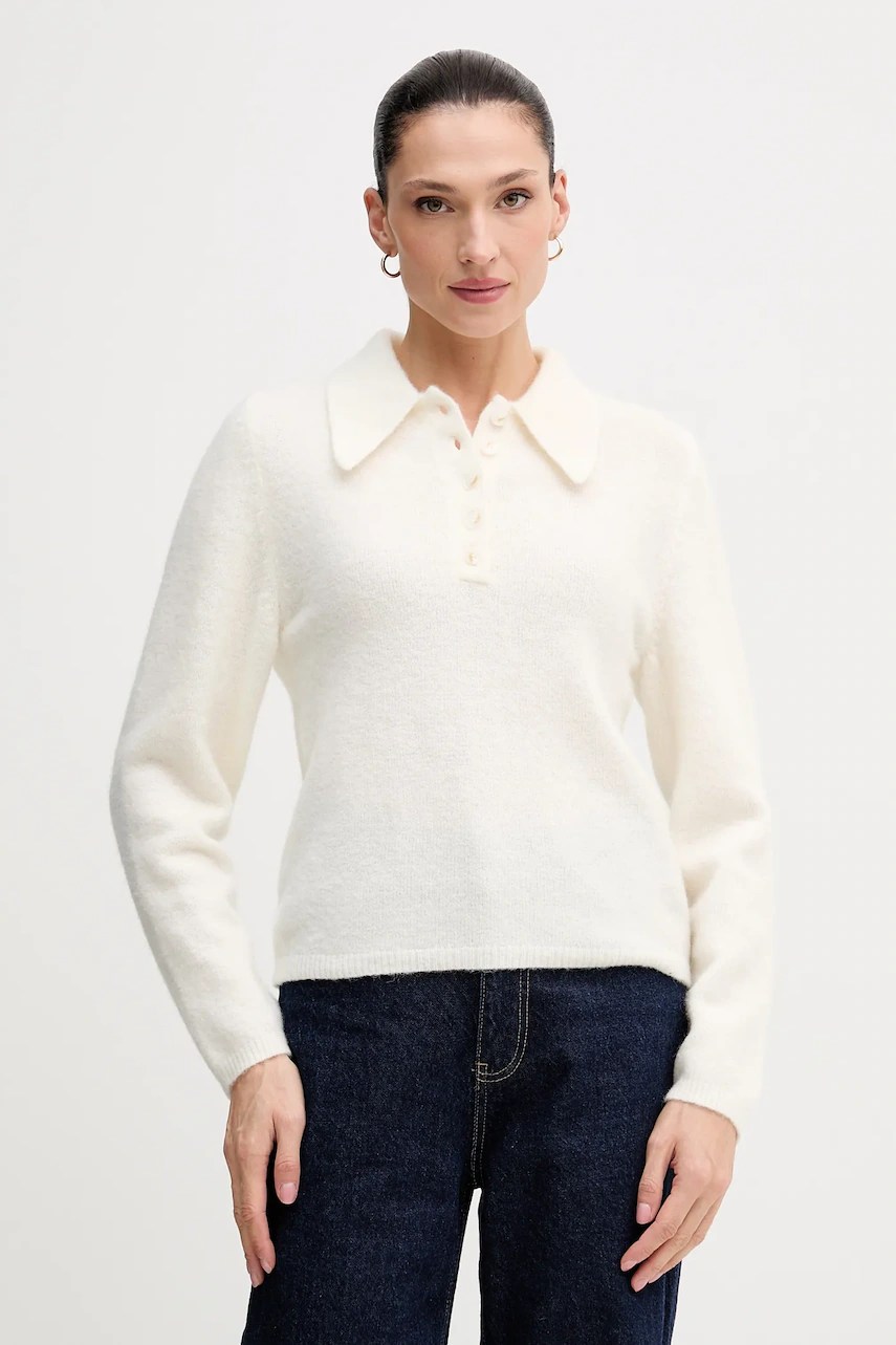 Acest pulover Gestuz combină lâna cu materiale reciclate din sticle PET, oferind o croială lejeră ce asigură libertatea de mișcare. Dotat cu decolteu în V și mâneci coborâte, acest model garantează confortul.