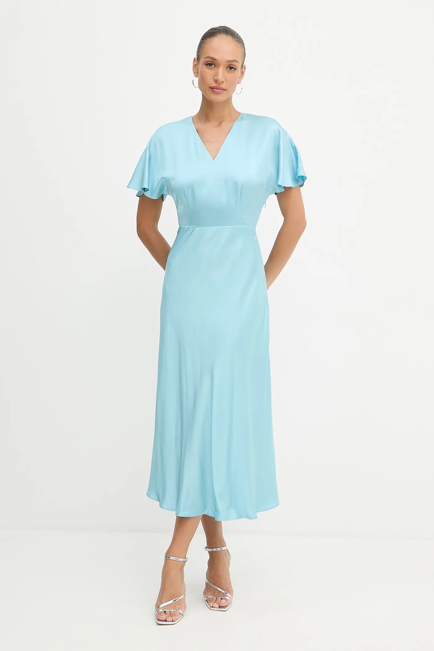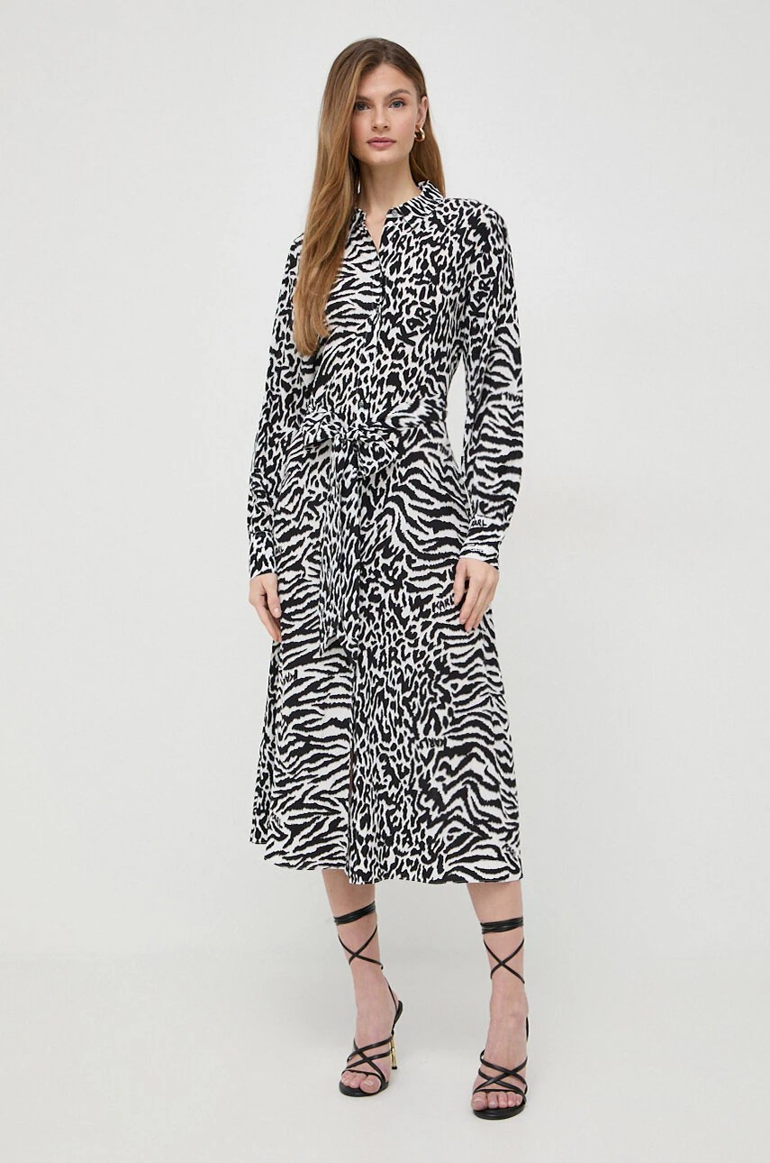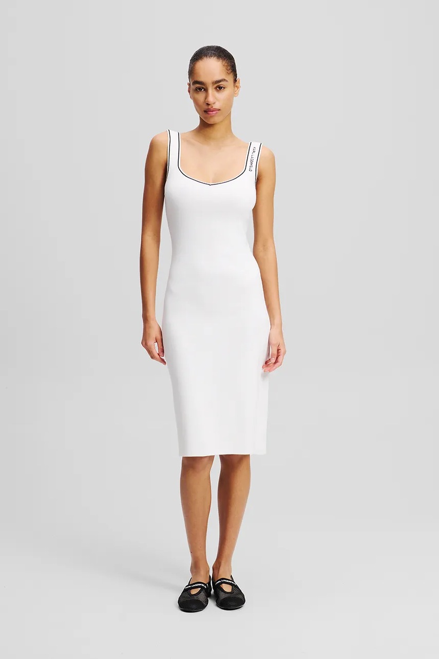 Rochie cu fason drept, semnată Karl Lagerfeld, cu decolteu în V și mâneci scurte. Aceasta include broderie decorativă și buzunare oblice. Realizată dintr-o stofă subțire, inflexibilă.