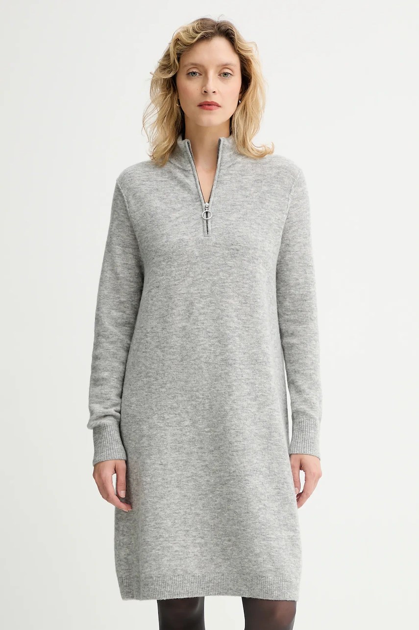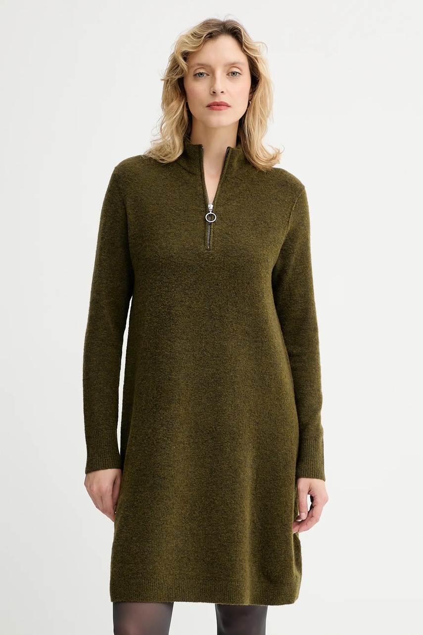 Această rochie Marc O’Polo este realizată din lână provenită de la ferme certificate RWS, asigurând bunăstarea animalelor și gestionarea responsabilă a terenurilor. Designul are un fason în cloș și guler moale, cu închidere scurtă pe nasturi.